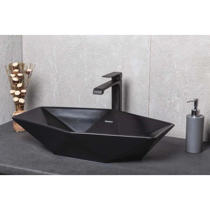 Umywalka ceramiczna nablatowa o awangardowym wzornictwie, wymiary 58x37x13 cm, kolor czarny w wykończeniu matowym. Dedykowana do nowoczesnych łazienek i armatury w kolorze czarnym lub złotym.