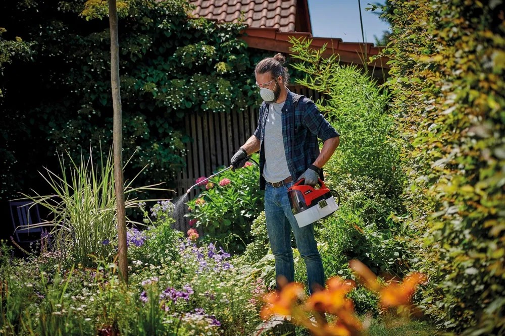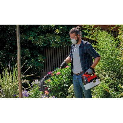 Akumulatorowy opryskiwacz Einhell wyposażony jest w automatyczną pompę, niewymagającą ręcznego zwiększania ciśnienia, transparentny pojemnik ze skalą, regulowaną mosiężną dyszę i wykonaną ze stali nierdzewnej lancę teleskopową wyposażoną w blokadę.