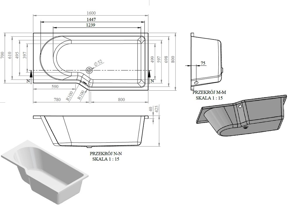 Wykonanie z wysokiej jakości akrylu o zwiększonej odporności na zarysowania, stanowi gwarancję idealnego wyglądu wanny przez długie lata. Szerokość wanny z węższej strony wynosi 70 cm.