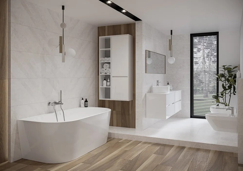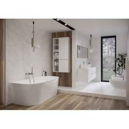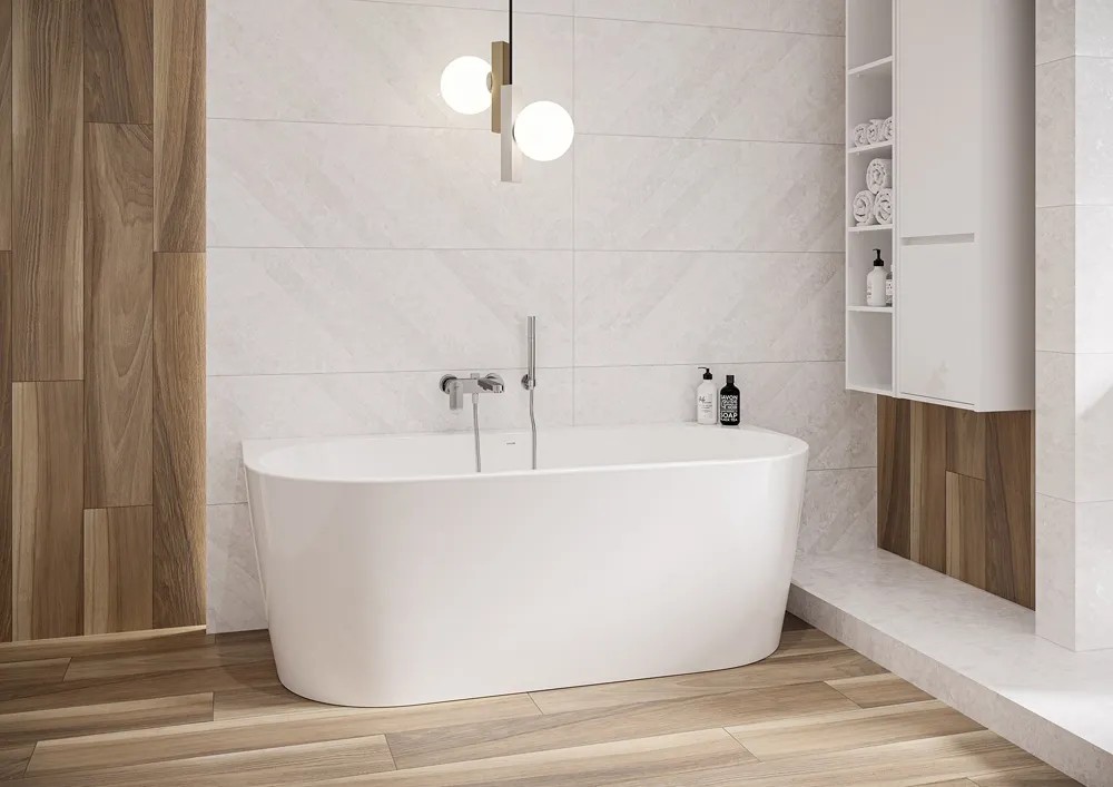 Wanna przyścienna wolnostojąca zajmuje zdecydowanie mniej miejsca w przeciwieństwie do klasycznych wanien wolnostojących. Można ją umieścić w narożniku łazienki lub przy jednej ze ścian. Ponadto wanny przyścienne dostępne są w różnych rozmiarach, przez co dopasujesz je do pomieszczenia, a także nie tworzą trudnodostępnych zakamarków.