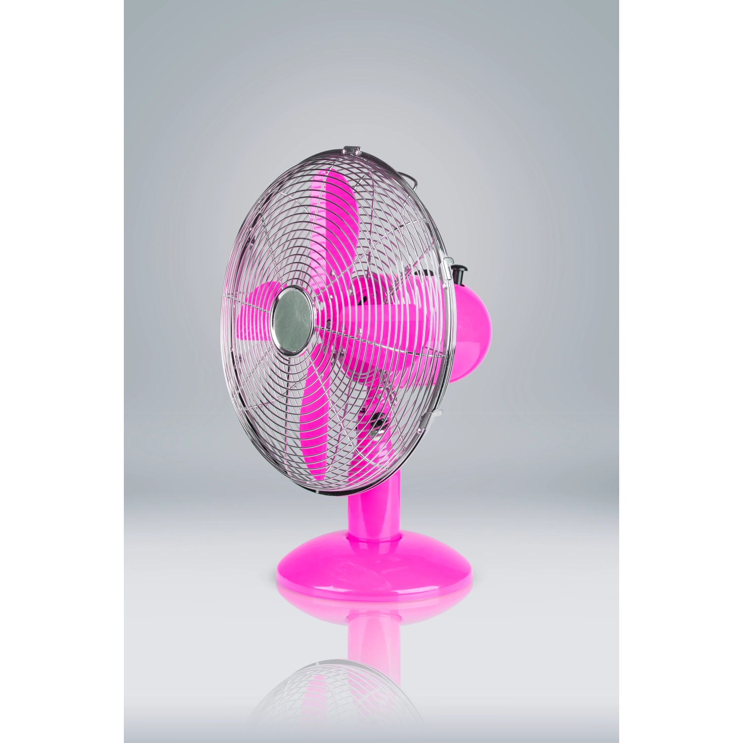 Wentylator biurkowy o średnicy 30 cm wykonany z metalu w kolorze różowym z automatyczną oscylacją. Posiada 4 aluminiowe łopatki w kolorze różowym, osłonę wykonaną z aluminium w kolorze chrom, przewód zasilający długości 1,5 metra oraz 3 stopniową regulację prędkości. Idealnie sprawdzi się w upalne dni.
