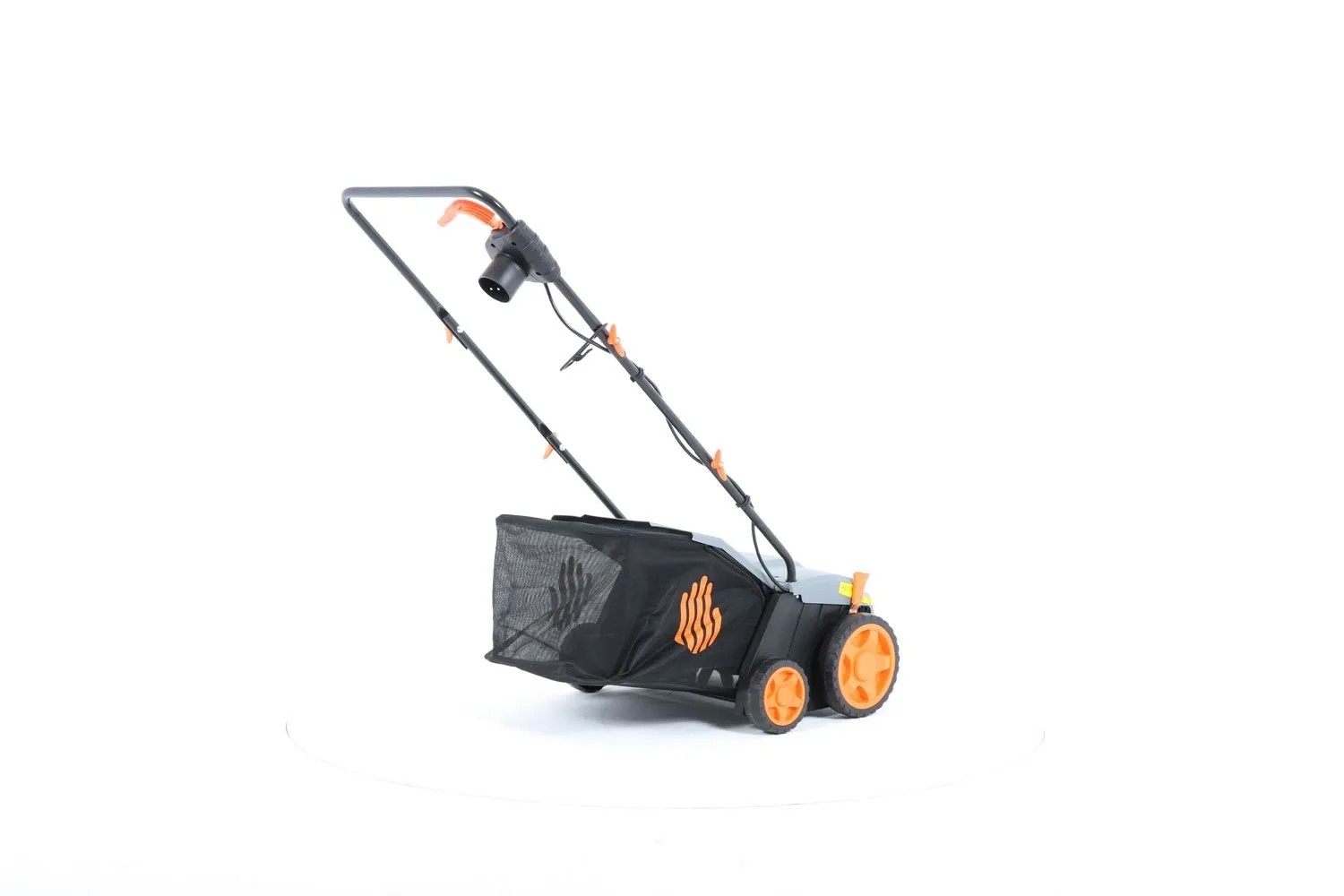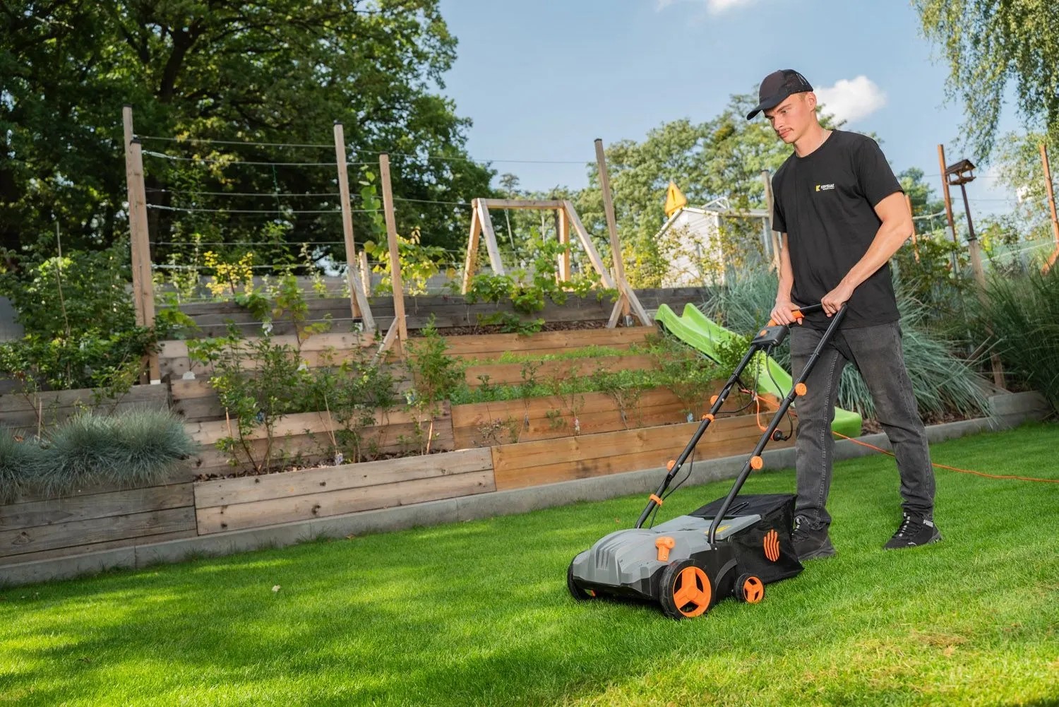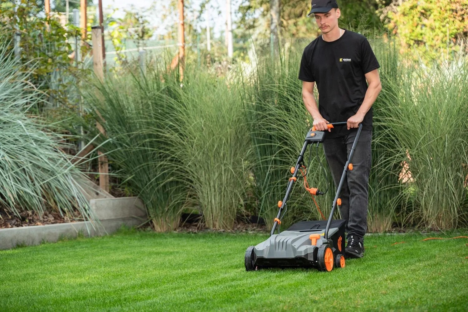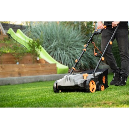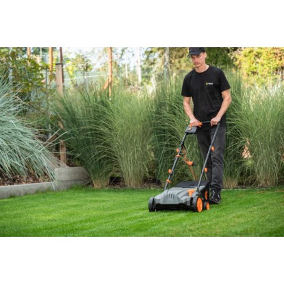 Szerokość robocza 32 cm pozwala na wygodne prowadzenie urządzenia na mniejszych i średnich powierzchniach, zapewniając jednocześnie odpowiednią wydajność pracy. Czterostopniowa regulacja głębokości w zakresie od -12 do 4 mm umożliwia dopasowanie intensywności zabiegu do aktualnego stanu trawnika - od delikatnego napowietrzania po głębsze nacinanie darni w celu usunięcia nagromadzonego filcu.