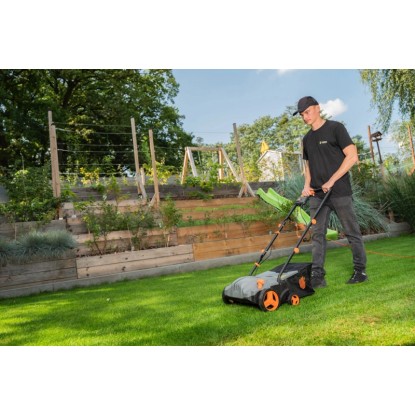 W zestawie znajdują się dwa wymienne wałki: do wertykulacji oraz do aeracji, co pozwala wykonać różne zabiegi pielęgnacyjne przy użyciu jednego urządzenia. Resztki roślinne i filc zbierane są do kosza o pojemności 30 litrów, co ułatwia utrzymanie porządku podczas pracy i ogranicza konieczność dodatkowego sprzątania.