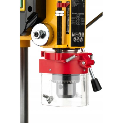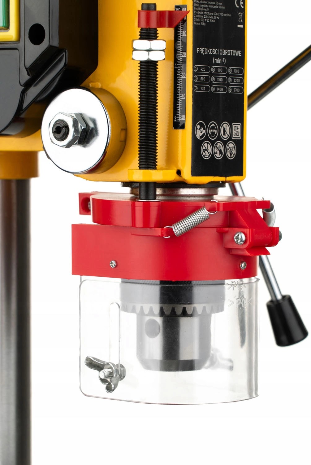 Urządzenie zostało wyposażone w przeźroczystą, wytrzymałą osłonę o regulowanej wysokości w zakresie 6-9 cm. Metalowy uchwyt zębaty umożliwia montaż wierteł o średnicy od 1,5 do 16 mm, natomiast płynnie regulowana głębokość skoku wrzeciona do 50 mm pozwala na precyzyjne ustawienie głębokości wiercenia. Stół roboczy oferuje możliwość regulacji kąta nachylenia w zakresie +/-45°, a maksymalna odległość między stołem a wrzecionem wynosi 220 mm.