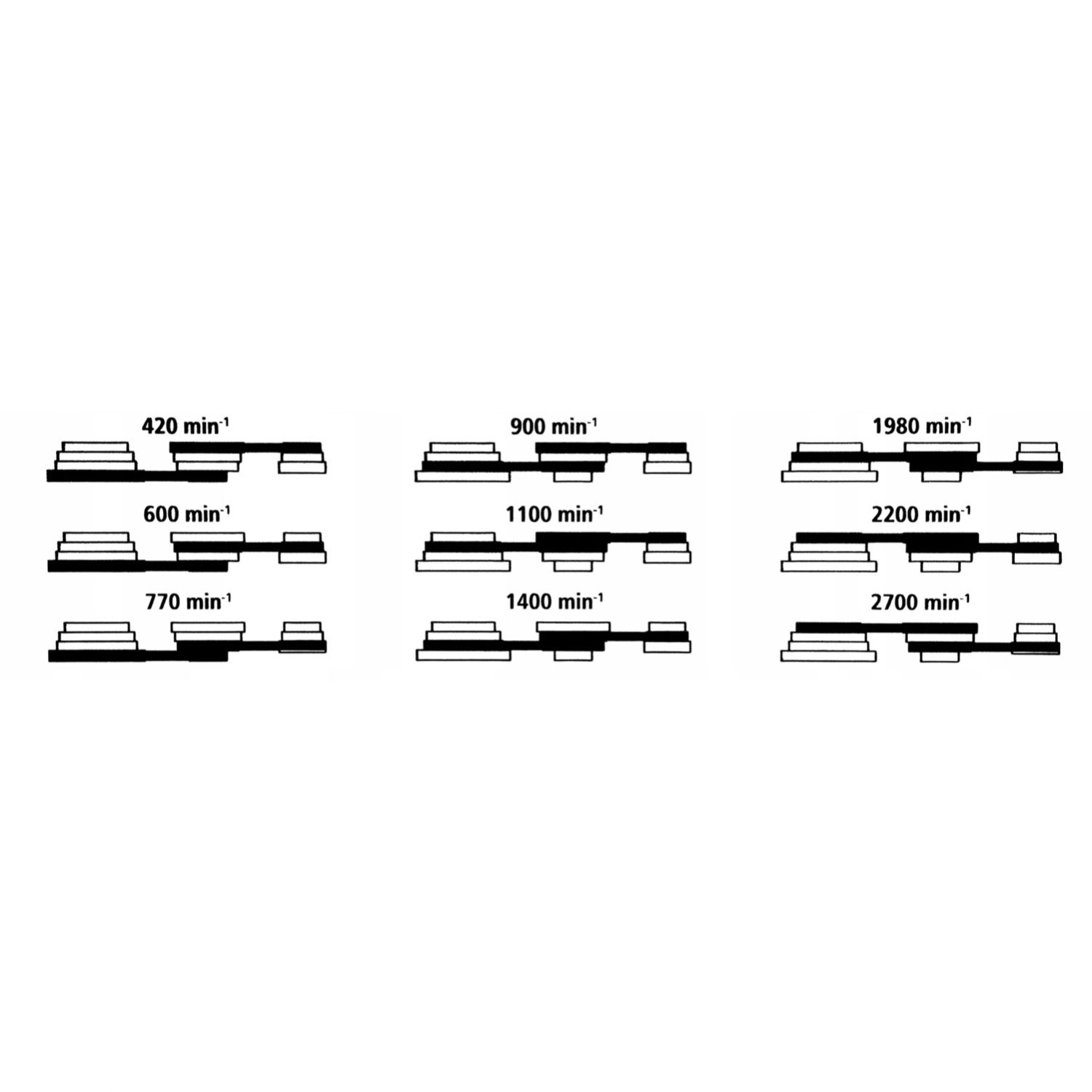 Prędkości obrotowe wrzeciona: 420 / 600 / 770 / 900 / 1100 / 1400 / 1980 / 2200 / 2700 obr/min