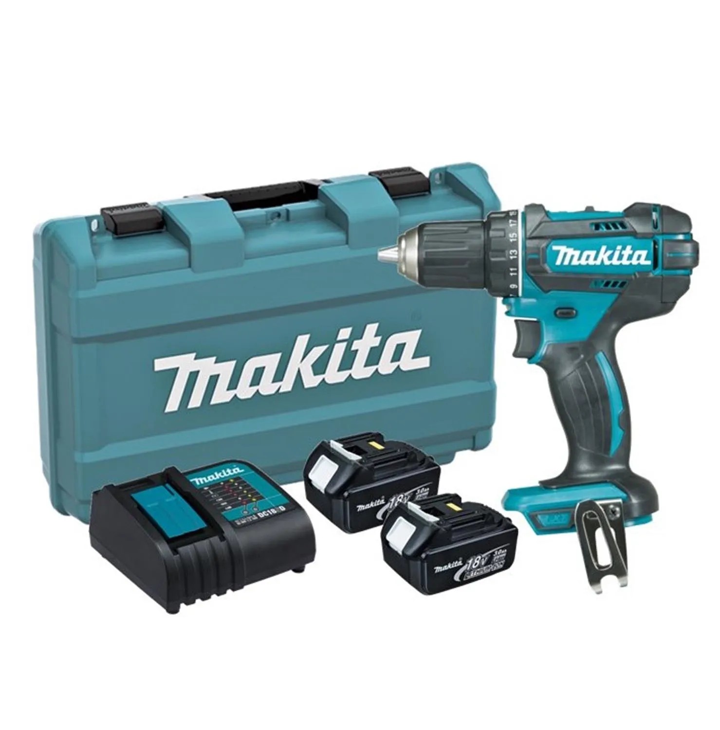 W zestawie z wiertarko-wkrętarką dostarczane są 2 akumulatory 18V o pojemności 3 Ah, ładowarka, zaczep do mocowania na pasku, końcówka wkrętakowa. Całość zapakowana jest w walizkę transportową.