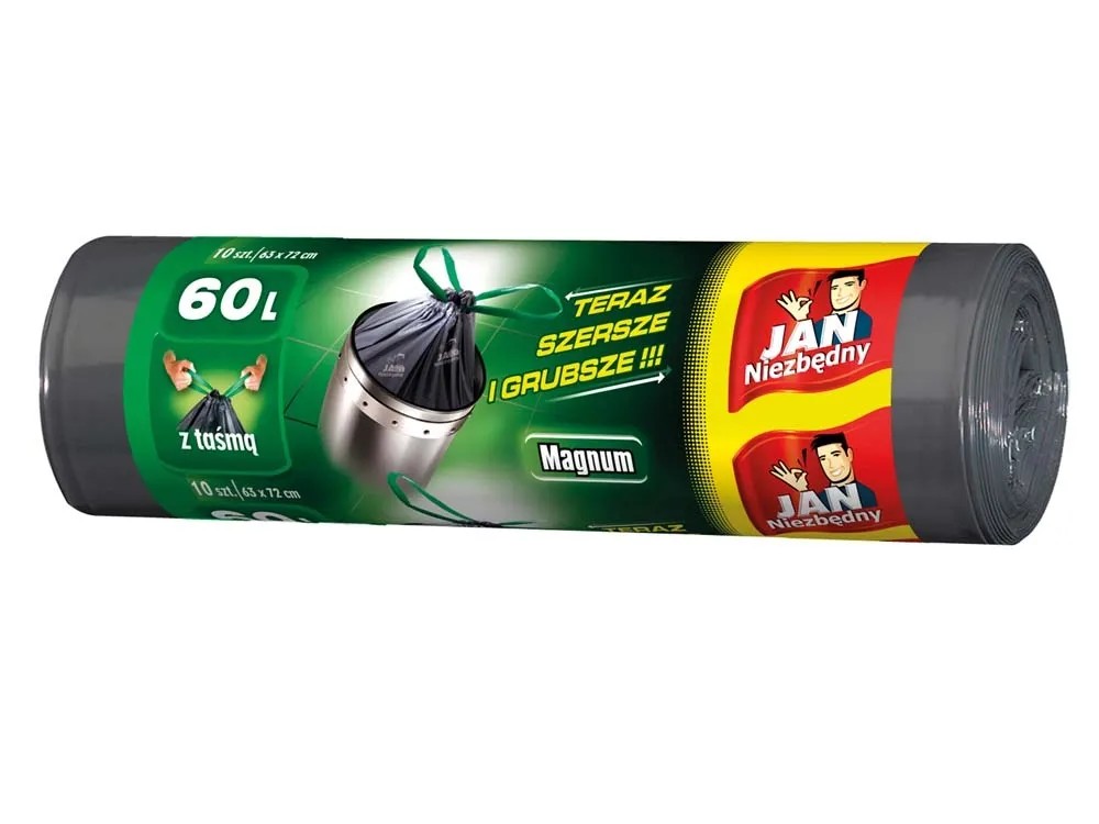 Worki na śmieci Jan Niezbędny Magnum o pojemności 60 l wykonano z grubej, dwuwarstwowej, nieprzezroczystej folii koloru grafitowego. Wykończone praktyczną, zieloną taśmą ściągającą, która pozwala na łatwy transport pełnego worka. Doskonale sprawdzają się w przechowywaniu różnego rodzaju odpadów pochodzących z gospodarstwa domowego.