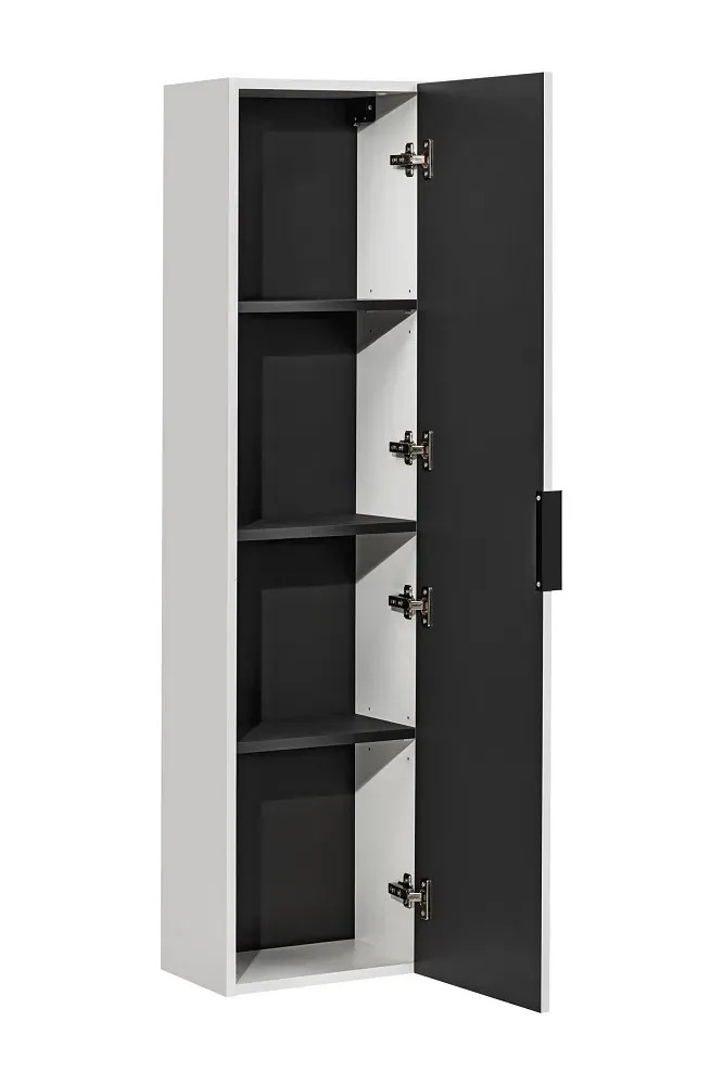 Duże drzwiczki wyposażone zostały w funkcję cichego domykania, ich otwieranie ułatwia wygodny, plastikowy uchwyt. Do słupka dołączone są trzy komplety uchwytów, w kolorze czarnym matowym, złotym i chromowanym w połysku. Możesz je dopasować do pozostałych elementów aranżacji takich jak armatura, lustra czy kafelki. W przyszłości umożliwi to bezkoszotowe odświeżenie wyglądu mebli, wymieniając kolor uchwytów. Korpus został wykonany z 16 mm płyty laminowanej, front z 16 mm płyty MDF z wykończeniem z PCV. Materiały te są odporne na wilgoć i uszkodzenia, dzięki czemu doskonale sprawdzą się w wymagającym środowisku łazienki.