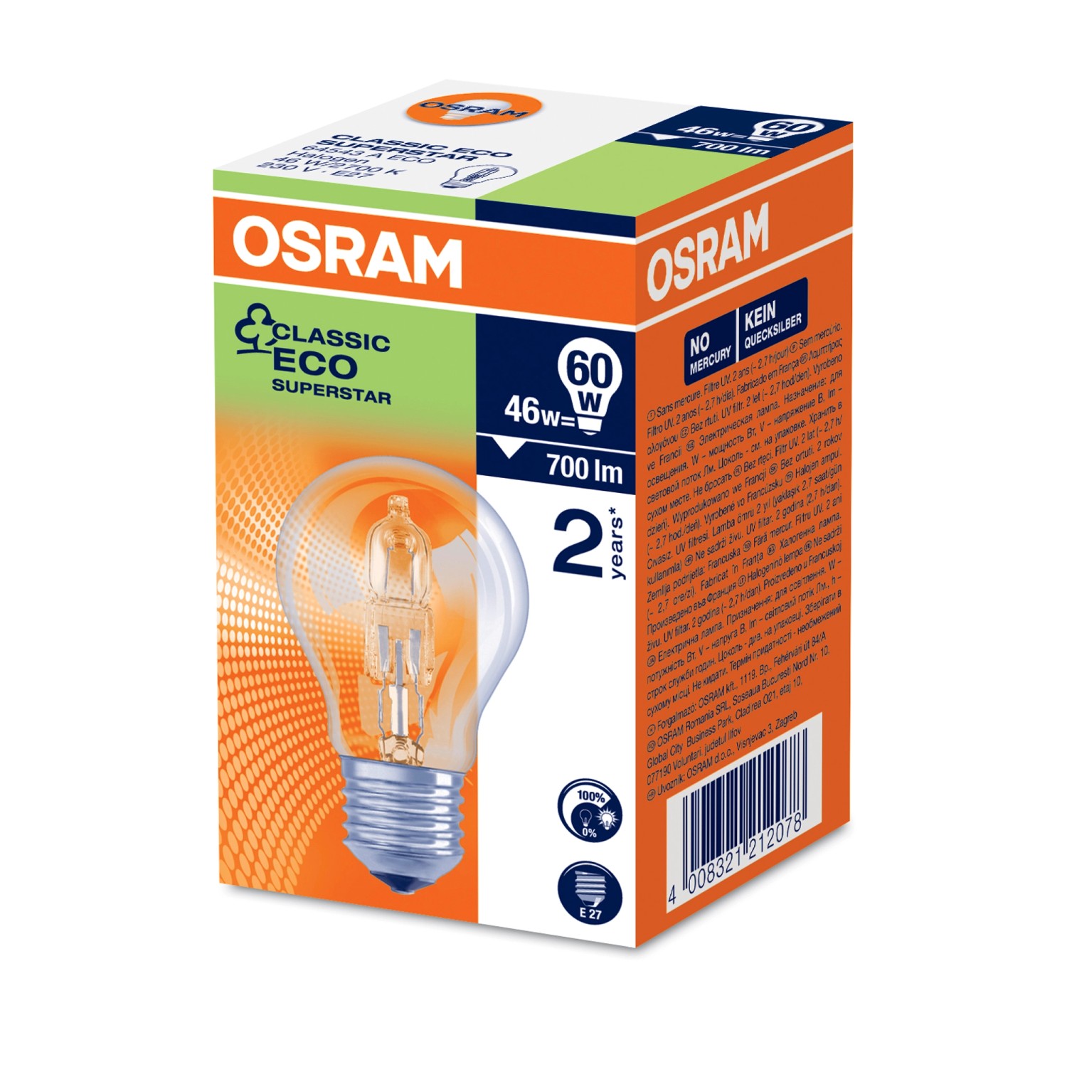 Żarówka halogenowa Eco Classic A o mocy 46W z gwintem E27 marki Osram. Jest to wysokiej jakości żarówka o bardzo niskim zużyciu energii.