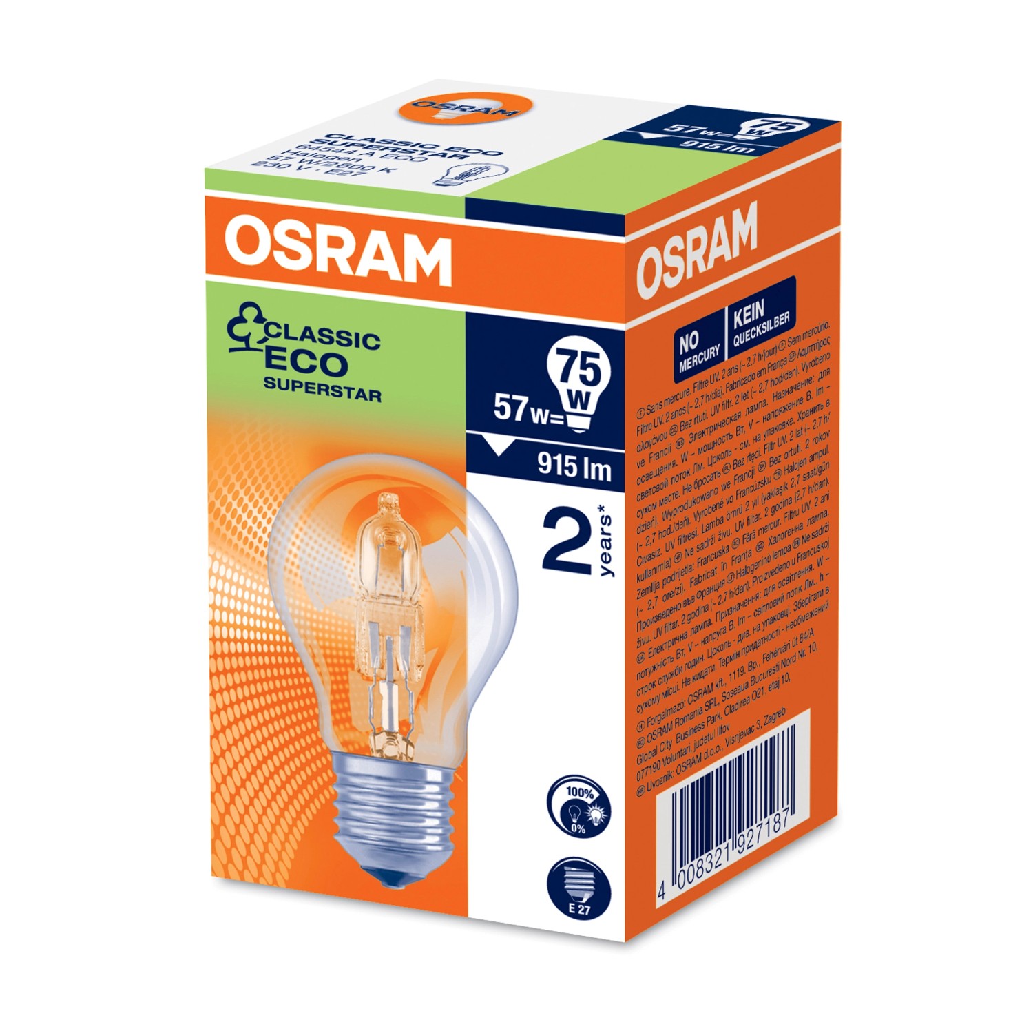 Żarówka halogenowa Eco Classic A o mocy 57W z gwintem E27 marki Osram. Jest to wysokiej jakości żarówka o bardzo niskim zużyciu energii.