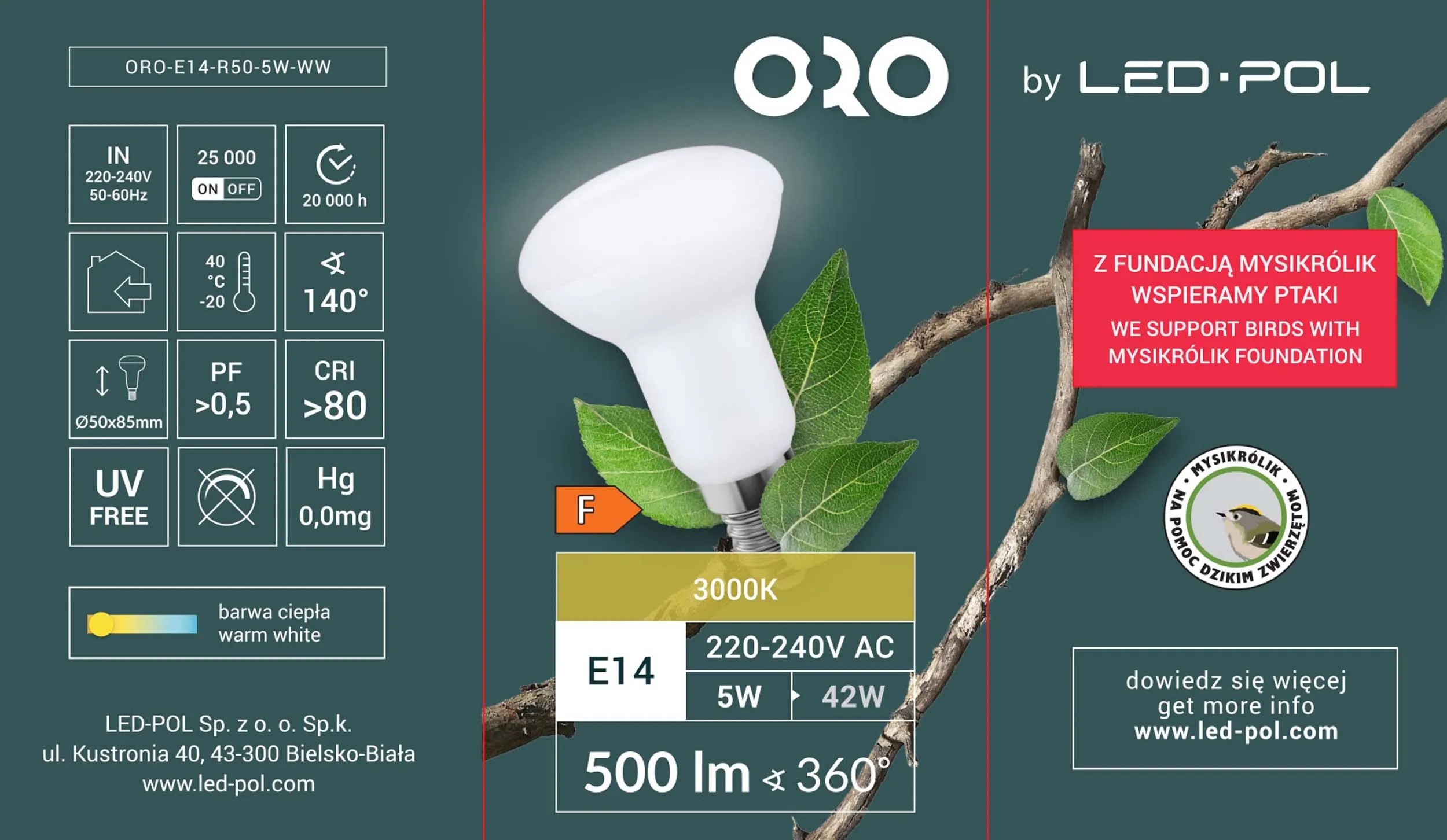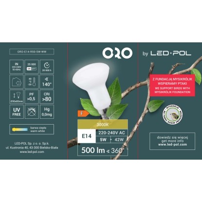 Źródło światła z gwintem E14 o mocy 5W emituje strumień świetlny na poziomie 500 lumenów o ciepłej białej barwie światła o temperaturze 3000K.
