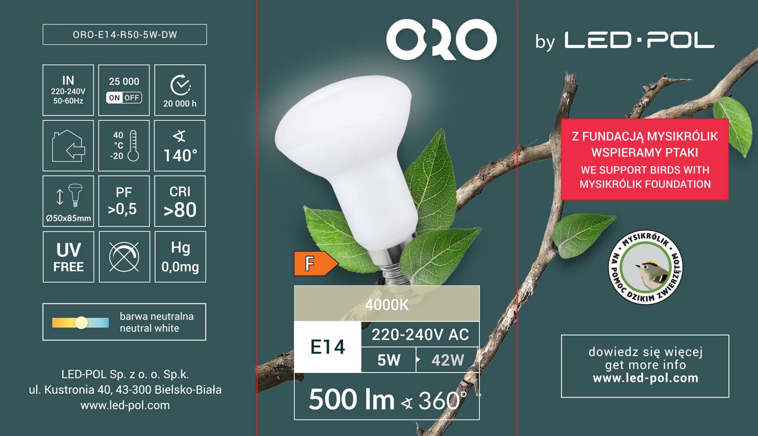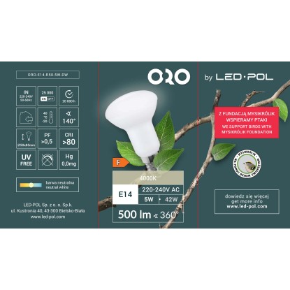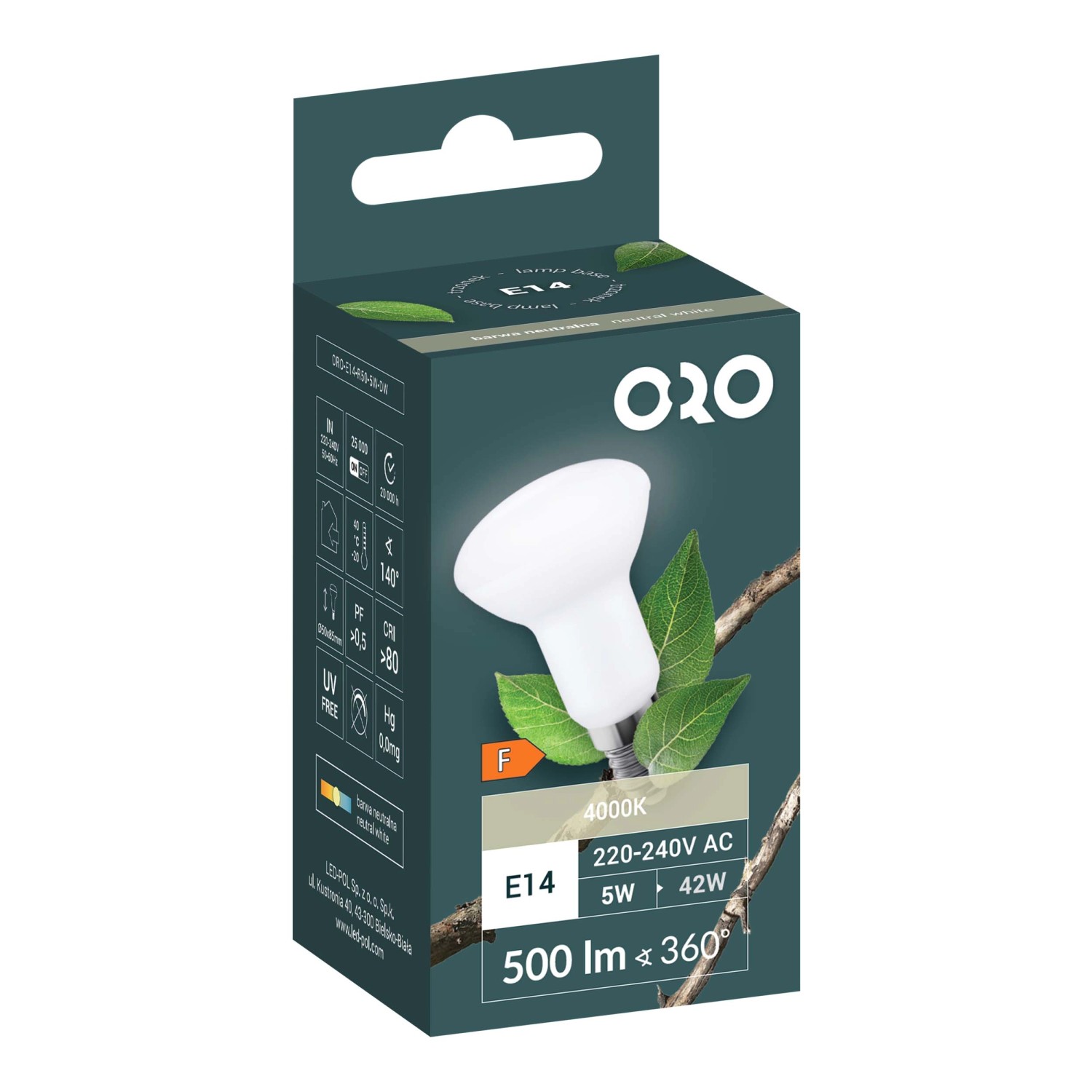Źródło światła z gwintem E14 o mocy 5W emituje strumień świetlny na poziomie 500 lumenów o neutralnej białej barwie światła o temperaturze 4000K.