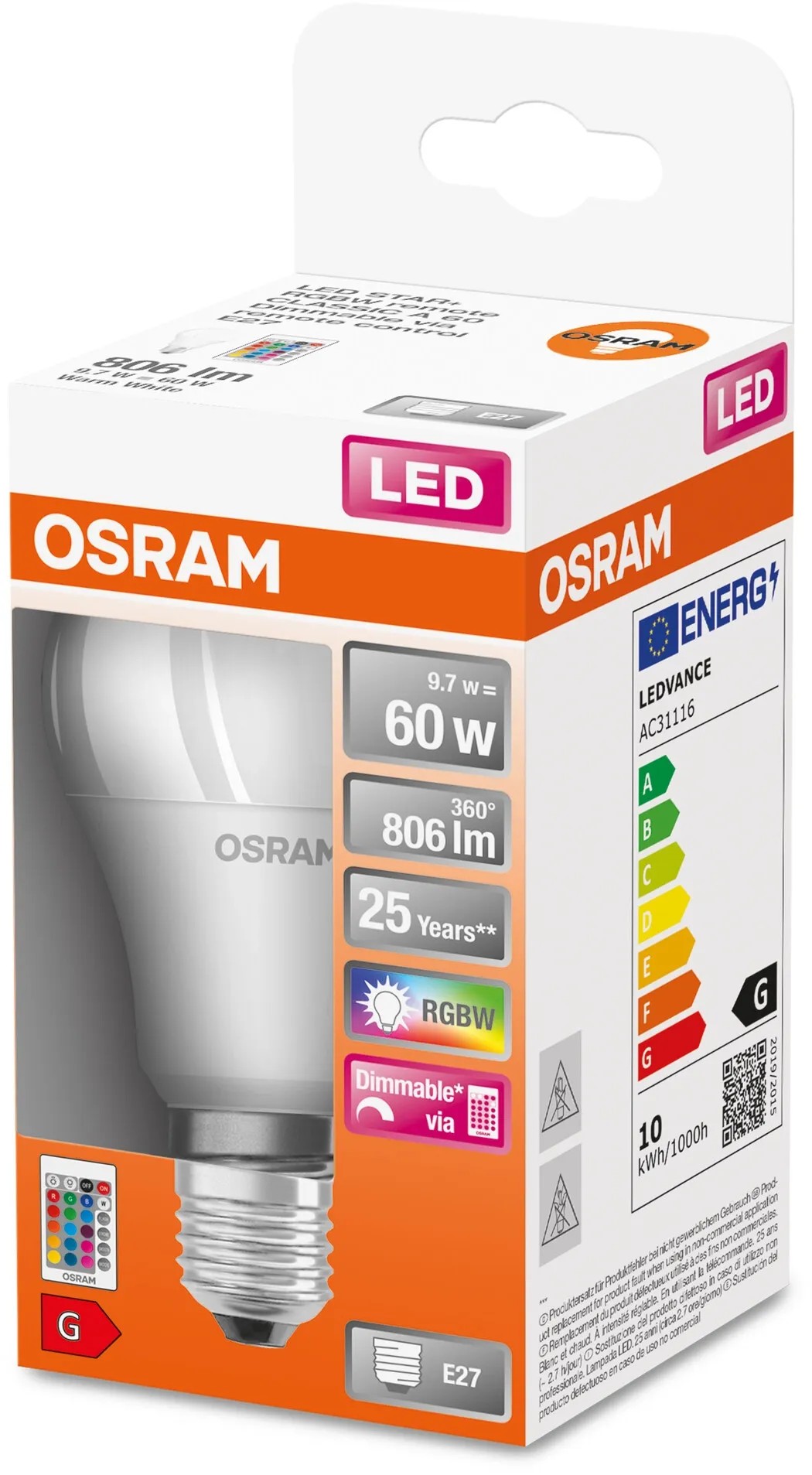Energooszczędne rozwiązanie dla domów, mieszkań i wszelkich pomieszczeń użytkowych. Emituje białe, ciepłe światło o temperaturze barwowej 2700K, dzięki czemu nie męczy oczu. Posiada klasę energetyczną G. Kąt rozsyłu światła wynosi 300 st. Strumień świetlny oscyluje na poziomie 806 lm. Funkcja zmiany kolorów odbywa się przy pomocy komfortowego w obsłudze i intuicyjnego pilota zdalnego sterowania na podczerwień.