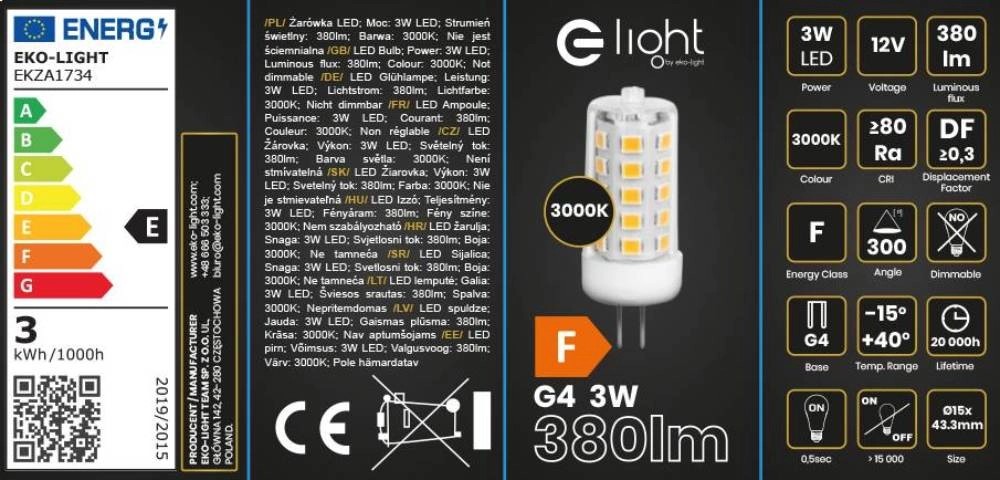 Źródło światła z gwintem G4 o mocy 3W emituje strumień świetlny na poziomie 380 lumenów o ciepłej białej barwie światła o temperaturze 3000K.