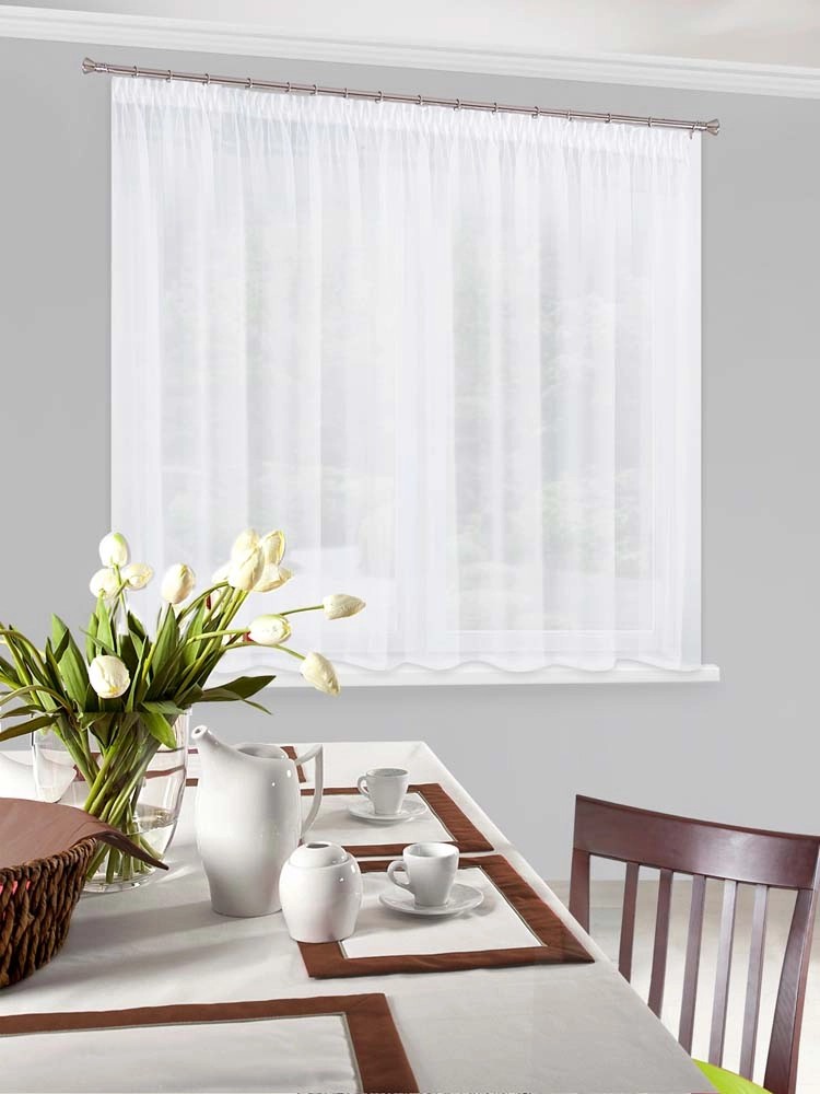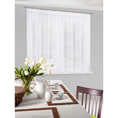 Gotowa do zawieszenia w oknie firana na taśmie, która ułatwia udrapowanie i zwieszenie na agrafkach, haczykach czy żabkach. Firana jest wyjątkowo wygodna w użytkowaniu poprzez łatwe przesuwanie na rurce karnisza. Stanowi stylowy i elegancki element wykończeniowy każdego okna, jednocześnie podkreślając charakter: salonu, kuchni, gabinetu czy innego pomieszczenia.