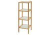 Regał wyposażony jest w cztery półki ze szkła mlecznego, dzięki czemu pomieści wszelkie akcesoria niezbędne w łazience.