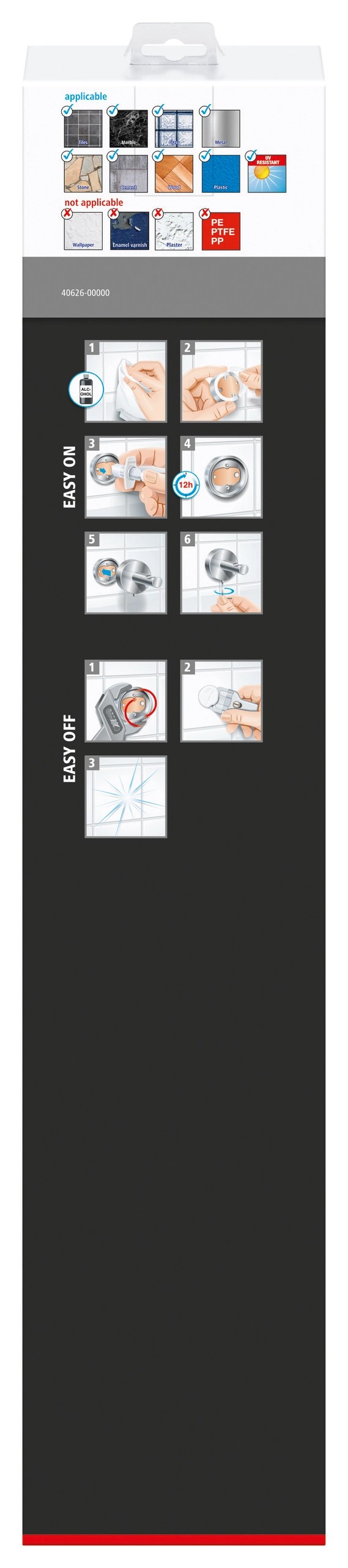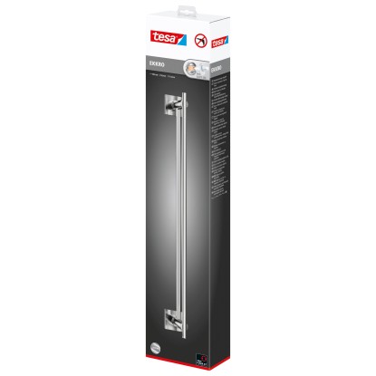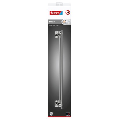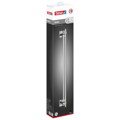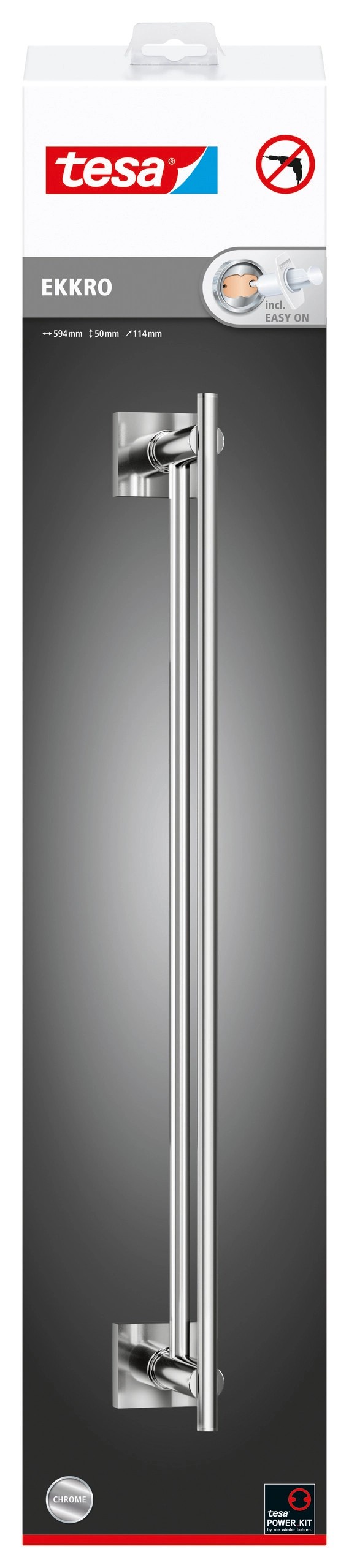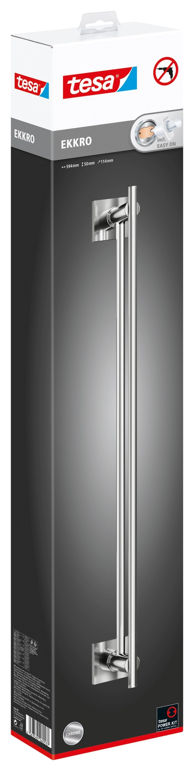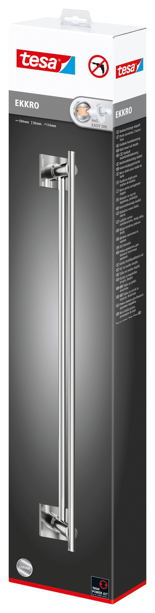 Drążek na ręczniki tesa Ekkro idealnie pasuje do nowoczesnego designu łazienki. Montowany za pomocą rozwiązania klejowego, które wymaga 12 godzin na utwardzenie i nie wymaga wiercenia. W rezultacie nie ma otworów po wierceniu, a płytki łazienkowe i ściany pozostają nienaruszone. Po usunięciu drążka nie pozostają żadne ślady. Dzięki nowemu adapterowi BK20-2 drążek można łatwo ponownie zamontować w innym miejscu., Wieszak na ręczniki z technologią tesa Power.Kit (wszystko w jednym rozwiązaniu montażowym), Wysoki połysk, chromowany metal, zaokrąglony styl, okrągłe płyty ścienne, dwa pręty na ręczniki, Niezawodne trzymanie, wodoodporny, gwarantowany nierdzewny, Działa na płytkach, metalu, kamieniu naturalnym, marmurze, betonie, drewnie, szkle i wielu rodzajach plastiku, Nie działa na tapetach, stiuku i innych powierzchniach z powłoką antyadhezyjną, Zdejmowalny bez śladu i ponownie używalny z adapterem BK20-2, Proste montowanie, bez wiercenia, Wymiary produktu: 112mm x 640mm x 50mm