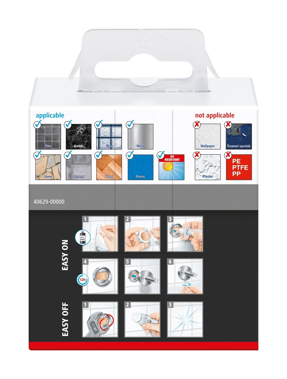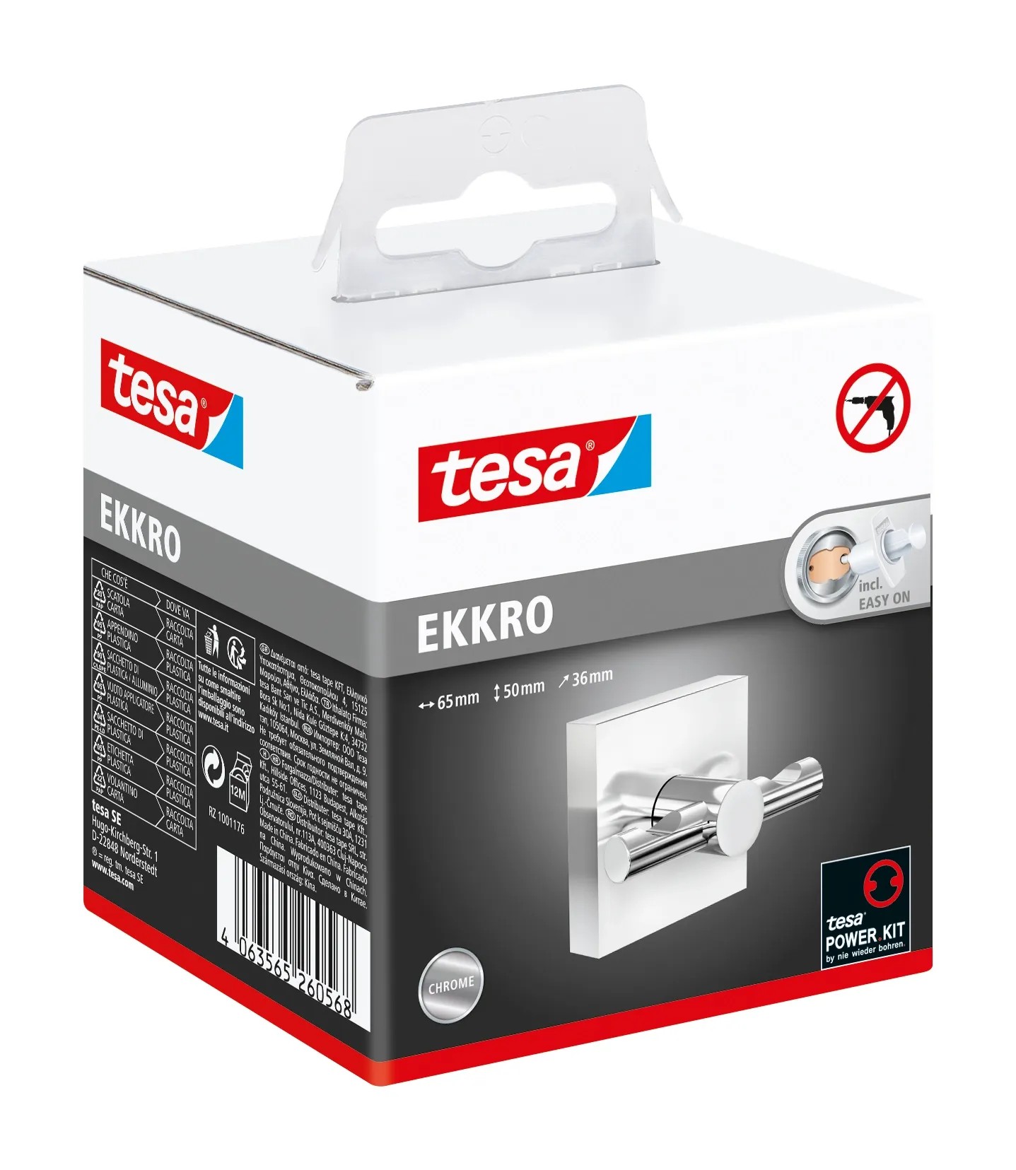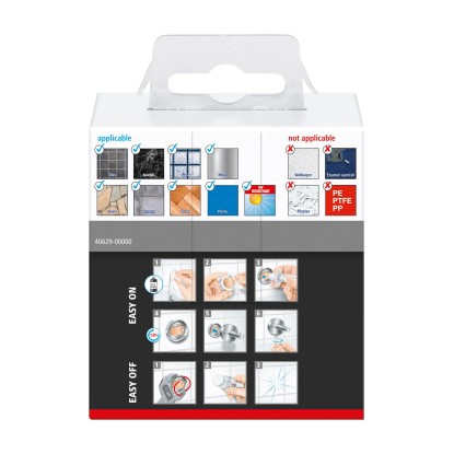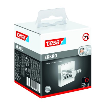Kątownikowy haczyk na szlafrok tesa® Ekkro jest wystarczająco wytrzymały, aby wspierać ciężkie ręczniki lub inne przedmioty. Dzięki błyszczącemu wyglądowi jest zarówno atrakcyjny, jak i niezawodny. Może być przymocowany za pomocą kleju, co zapobiega uszkodzeniom powierzchni. Po 12 godzinach schnięcia, haczyk jest gotowy do użycia. Można go również łatwo zdjąć bez pozostawiania śladów. Można go ponownie użyć w innym miejscu za pomocą nowego adaptera BK20., Wieszak na szlafrok z technologią tesa® Power.Kit (wszystko w jednym rozwiązaniu montażowym), Wysoki połysk, chromowany metal, kanciasty styl, wielofunkcyjny, Bezpieczne mocowanie na ścianie, wodoodporny, gwarantowany nierdzewny, Działa na płytkach, metalu, kamieniu naturalnym, marmurze, betonie, drewnie, szkle i wielu rodzajach plastiku, Nie działa na tapecie, stiuku i innych powierzchniach z powłoką antyadhezyjną, Łatwo zdejmowalny bez śladu, ponownie używalny z adapterem BK20, Łatwy montaż, bez wiercenia, Wymiary produktu: 62,5mm x 50mm x 50mm