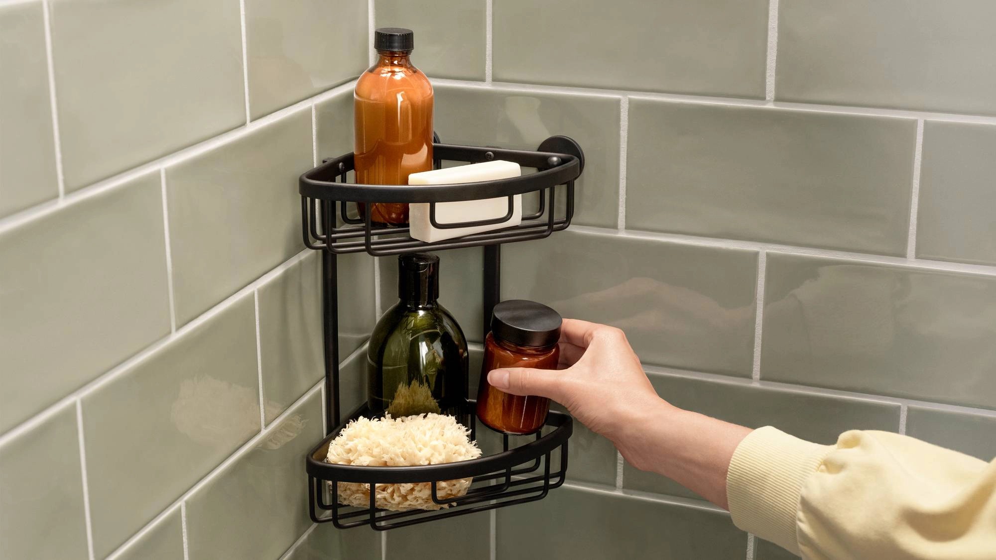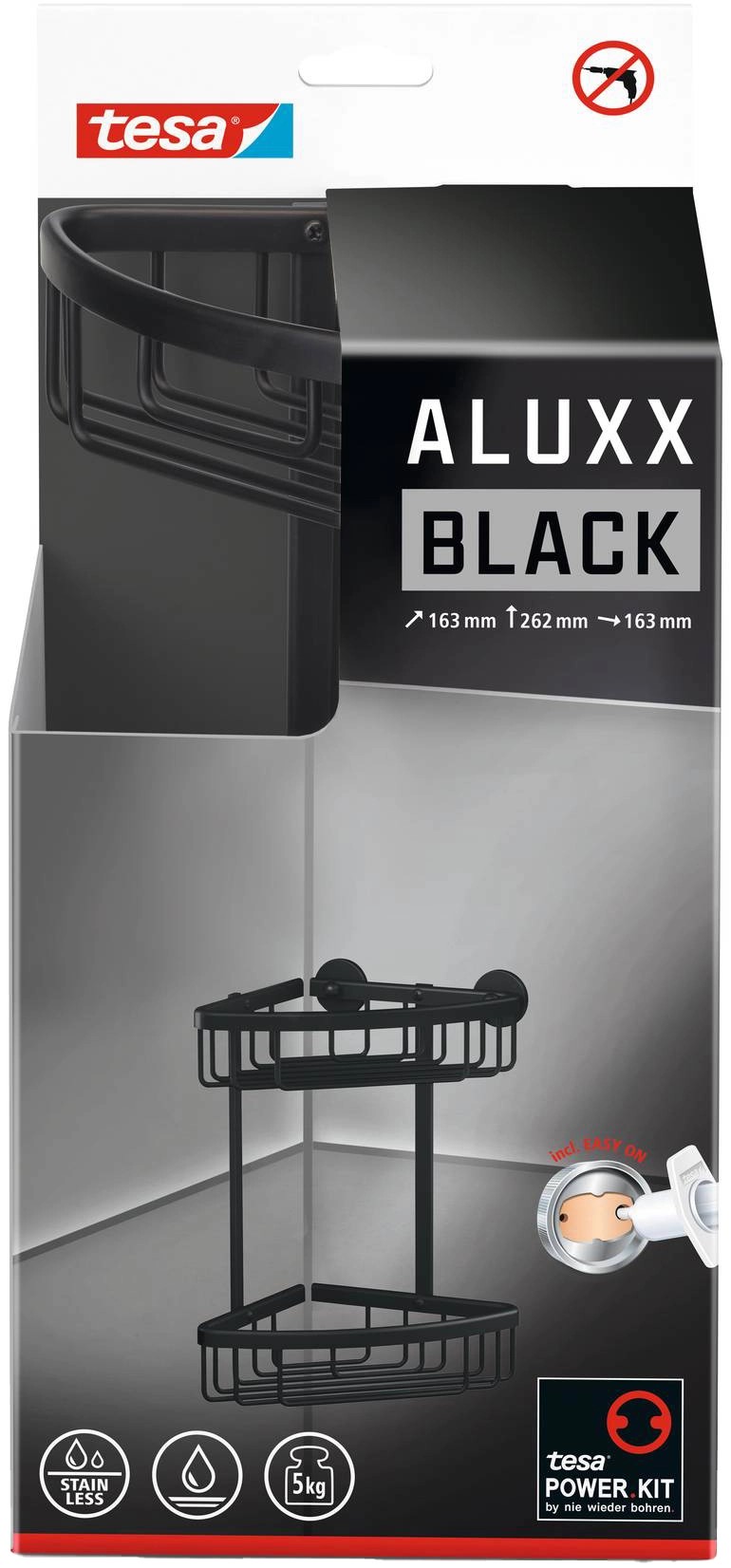 Wielofunkcyjne akcesorium łazienkowe pasujące do każdego wystroju wnętrza - kompatybilne z łazienkami w stylu industrialnym lub skandynawskim. Ten przyciągający wzrok koszyk w eleganckim matowym czarnym kolorze będzie również świetnie wyglądał w modnych, vintage i loftowych wnętrzach. Przechowuj swoje akcesoria łazienkowe w najstylowszy i najwygodniejszy sposób, mając wszystkie kosmetyki zawsze pod ręką w prysznicu. Nie musisz martwić się o uszkodzenia - ten dwupoziomowy koszyk narożny pod prysznic można łatwo usunąć bez pozostawiania śladów. Dodatkowo, można go również łatwo ponownie zamontować - wystarczy odpowiedni adapter BK43-2, który można kupić osobno., Podwójny koszyk narożny z technologią tesa® Power.Kit (wszystko w jednym rozwiązaniu montażowym), Matowy czarny anodowany aluminium, harmonijny zaokrąglony styl, okrągłe płyty ścienne, wodoodporny, nierdzewny, Stylowe i praktyczne przechowywanie przedmiotów łazienkowych - specjalnie zaprojektowane do prysznica i wanny, Idealny dodatek do łazienek w stylu industrialnym lub skandynawskim, Przylega do glazurowanych płytek, metalu, kamienia naturalnego, marmuru, betonu, drewna, szkła i wielu rodzajów plastiku, Nie nadaje się do tynku, tapety, plastiku takiego jak PP, PE, PTFE i innych powierzchni z powłoką antyadhezyjną, Niezawodny montaż na ścianie, łatwy i czysty w instalacji, bez wiercenia, zdejmowalny bez uszkodzenia powierzchni, Możliwość ponownego montażu po zdjęciu z nowym adapterem BK43-2 - adapter również dostępny osobno, Wymiary produktu: 262mm x 163mm x 163mm