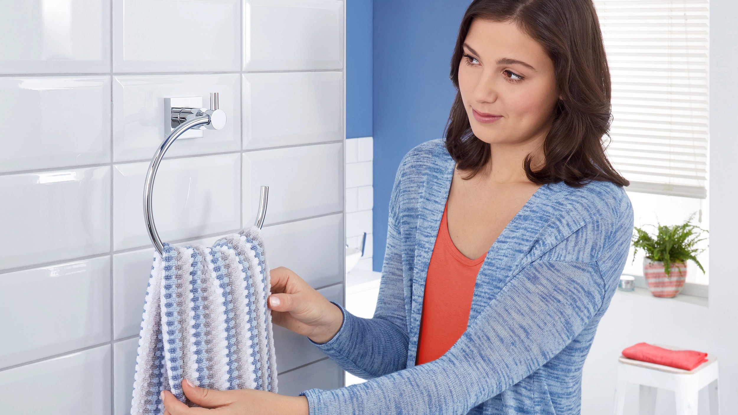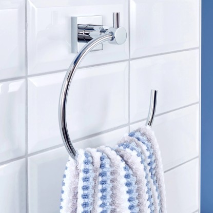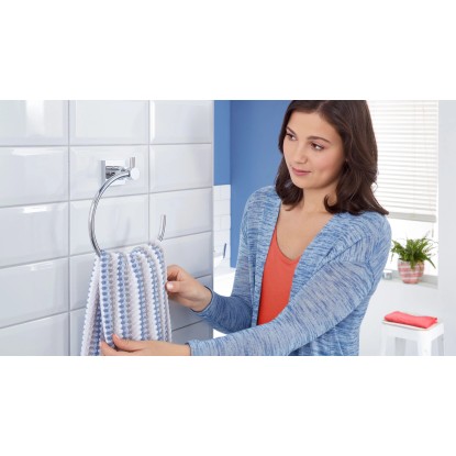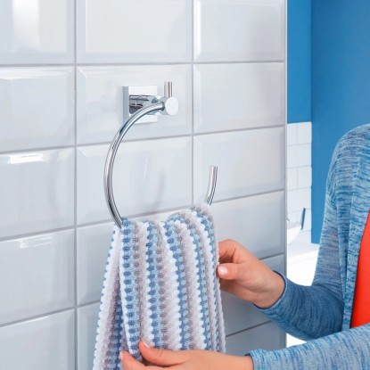 Naścienny okrągły wieszak z samoprzylepnym systemem montażowym typu wszystko w jednym. Do montażu nie są potrzebne żadne dodatkowe narzędzia takie jak śrubokręt czy wiertarka. Demontaż jest równie prosty jak i montaż. Mocowanie jest niezwykle trwałe, nie pozostawia śladów. Praktyczny kształt ułatwia podejmowanie oraz zawieszanie ręczników. Błyszczące chromowe wykończenie gwarantuje pełną nierdzewność i odporność na warunki panujące w łazience. Korzystanie z wieszaka możliwe jest po 12 godzinach od montażu. Maksymalne obciążenie wynosi 5 kg.