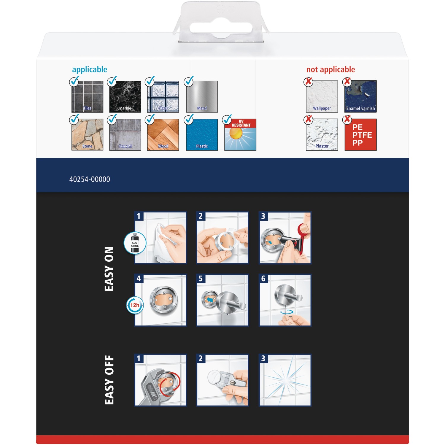 Zalecane powierzchnie mocowania: płytki, marmur, szkło, metal, kamień, cement, drewno, plastik (oprócz PE, PTFE, PP).