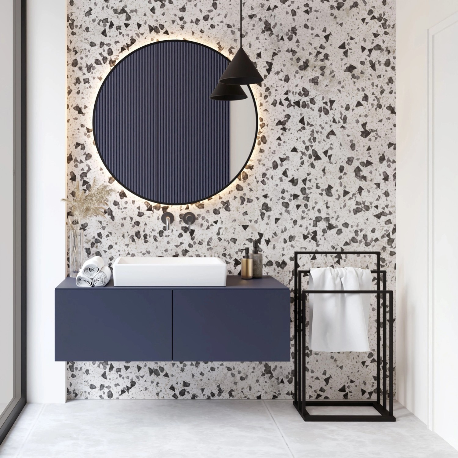 Wolnostojący wieszak o minimalistycznym designie, wykonany z trwałej, malowanej proszkowo stali. Jego smukła konstrukcja doskonale sprawdzi się w nowoczesnych wnętrzach, oszczędzając miejsce na ścianach. Wysoka odporność na wilgoć czyni go idealnym wyborem do łazienki, ale jego uniwersalna estetyka pasuje również do innych pomieszczeń. To stylowe i praktyczne rozwiązanie dla osób ceniących prostotę i wysoką jakość wykonania.
