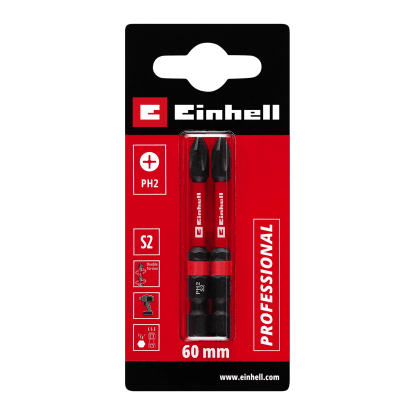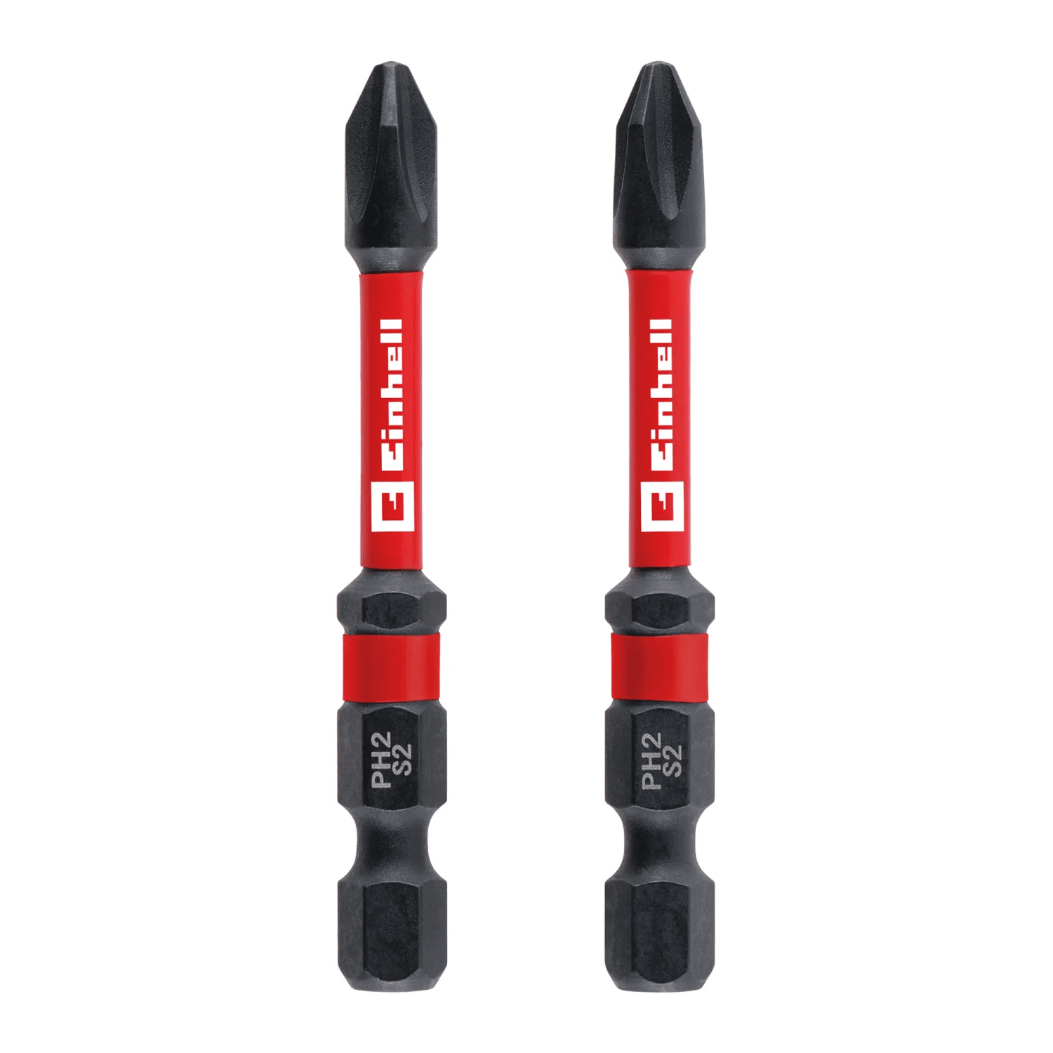 Zestaw bitów udarowych Einhell o profilu PH2 i długości 60 mm wykonany jest z wyjątkowo twardej, odpornej na uderzenia stali S2 fosforanowanej manganowo i posiadają czerwony pierścień z logo Einhell.