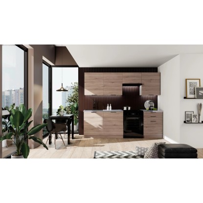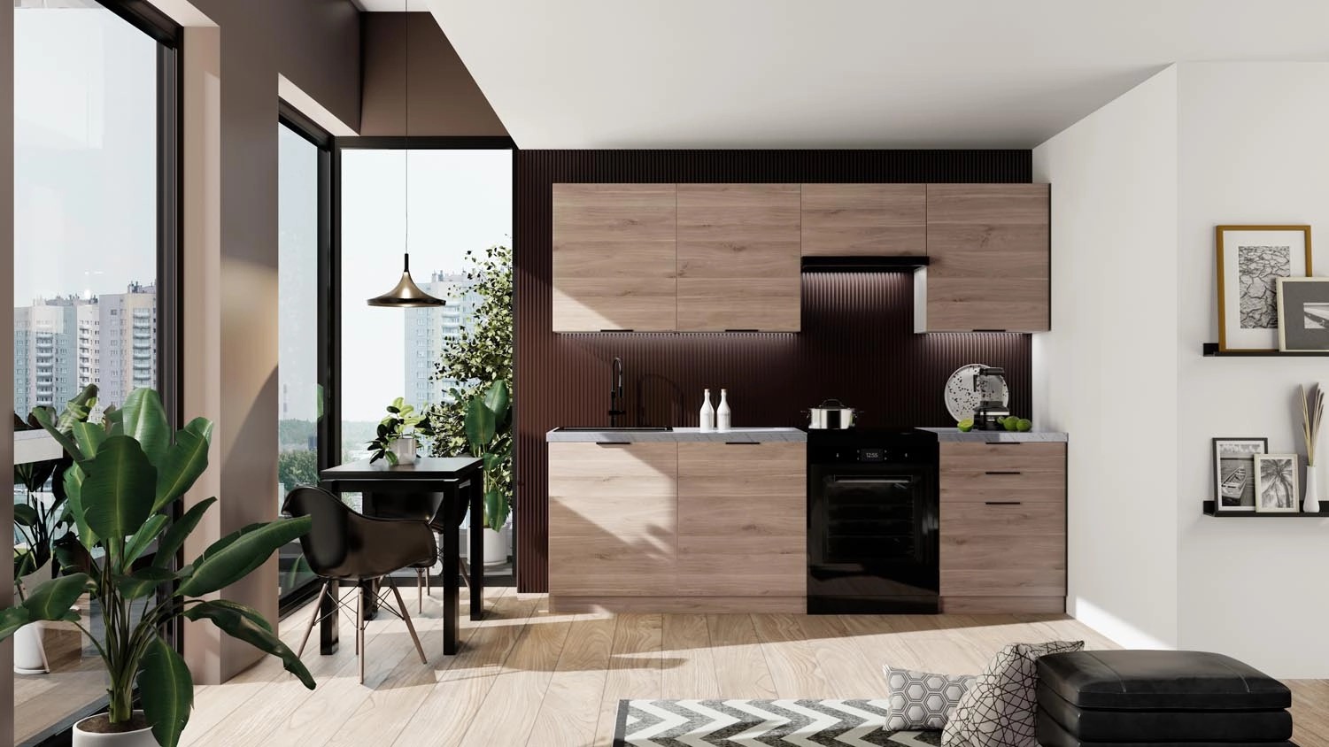 Meble z serii Caren będą doskonałym wyborem zarówno do małych, jak i większych kuchni lub aneksów kuchennych. Wykończenie w kolorze Dąb Nostalgia dodaje ciepła i przytulności do każdego wnętrza, a piękna struktura drewna podkreśla naturalny charakter mebla. Doskonale komponują się z różnorodnymi stylami wnętrz. Elegancji dodają czarne uchwyty krawędziowe.