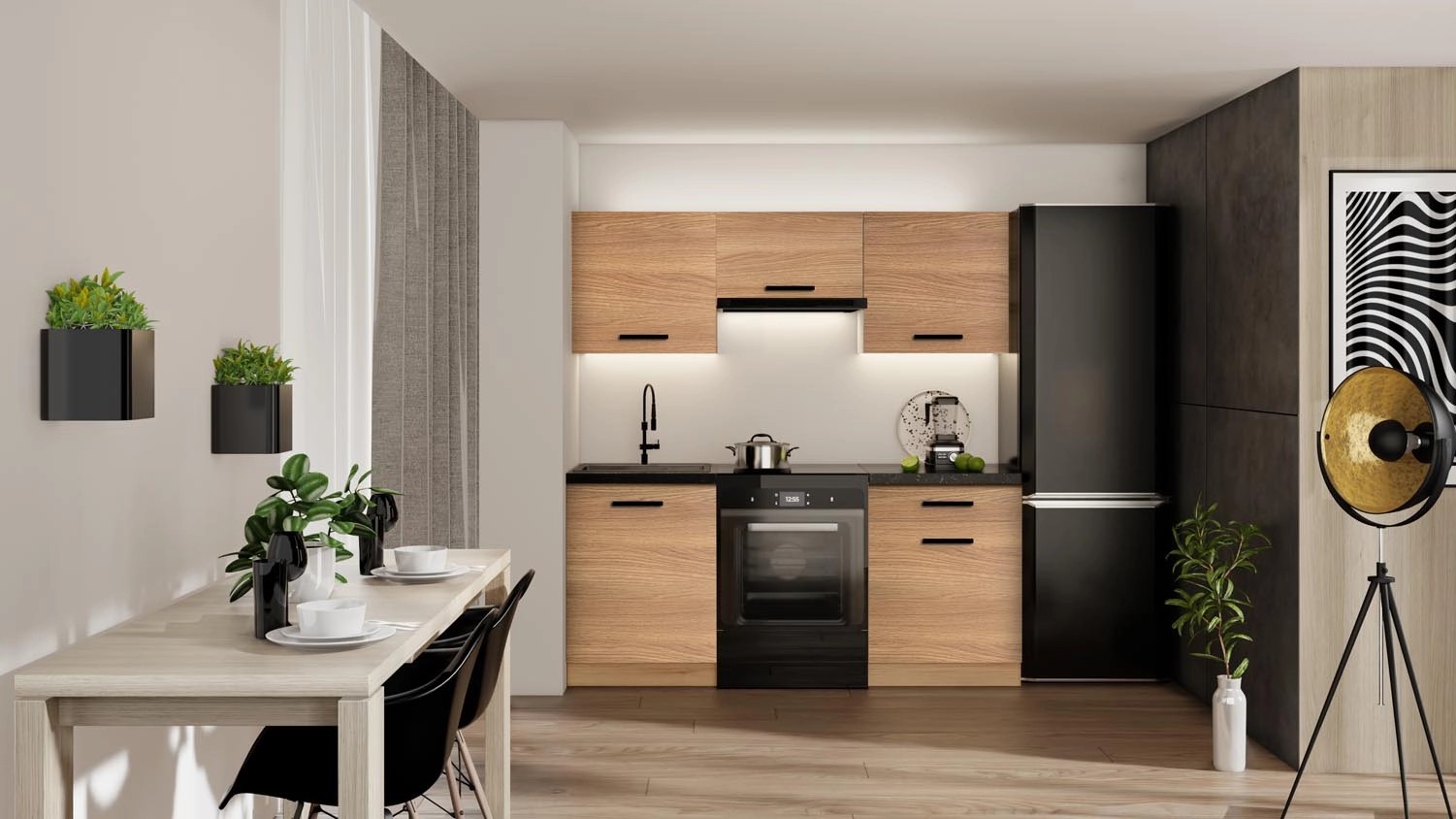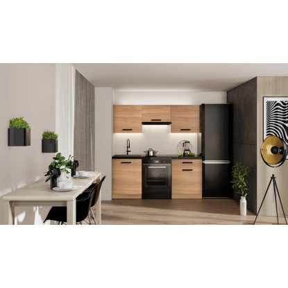 Meble z serii Eco II będą doskonałym wyborem zarówno do małych, jak i większych kuchni lub aneksów kuchennych. Wykończenie w kolorze Dąb Natura dodaje ciepła i przytulności do każdego wnętrza, a piękna struktura drewna podkreśla naturalny charakter mebla. Doskonale komponują się z różnorodnymi stylami wnętrz. Elegancji dodają czarne proste uchwyty.
