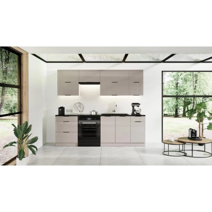 Front szafki został wykończony na wysoki połysk w stonowanym, kaszmirowym kolorze, dzięki czemu prezentuje się niezwykle elegancko i nowocześnie. Świetnie wpisze się w wystrój każdego wnętrza.