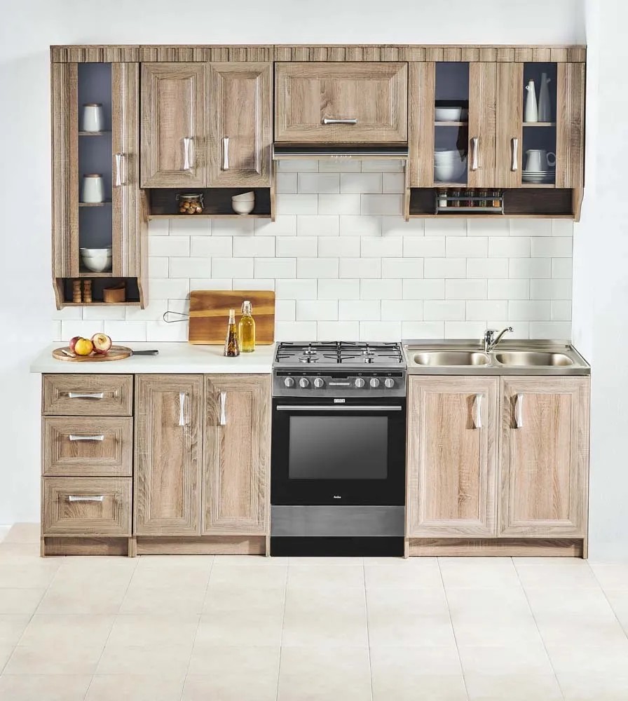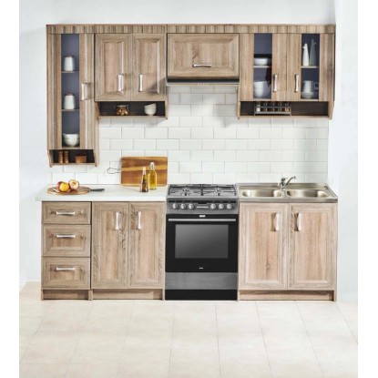 Jest to doskonałej jakości stojąca szafka kuchenna z trzema pojemnymi szufladami. Wykonana z laminowanej płyty wiórowej w kolorze dąb sonoma tabac. Posiada fronty wykończone ramą z MDF, w tym samym kolorze. Chromowane uchwyty zapewniają jej stylowy wygląd.