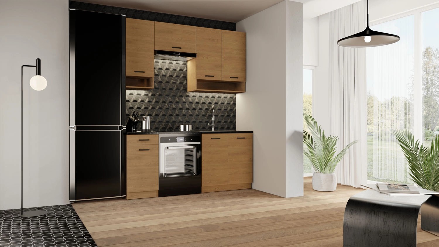 Zdjęcia aranżacyjne są zdjęciami poglądowymi, zestaw nie zawiera blatu, zlewu oraz innych akcesoriów kuchennych.