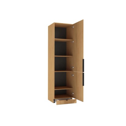 Idealne rozwiązanie dla posiadaczy niewielkich przestrzeni. Słupek jest praktyczny i pojemny przy jednoczesnym zachowaniu kompaktowych wymiarów. W jego wnętrzu zaprojektowano sporą przestrzeń na przechowywanie produktów spożywczych, talerzy i innych akcesoriów. Dodatkowo, szafka została wyposażona w szufladę ukrytą w cokole.
