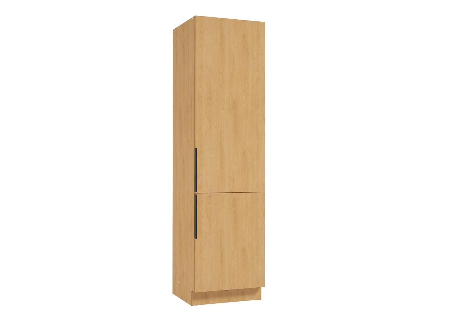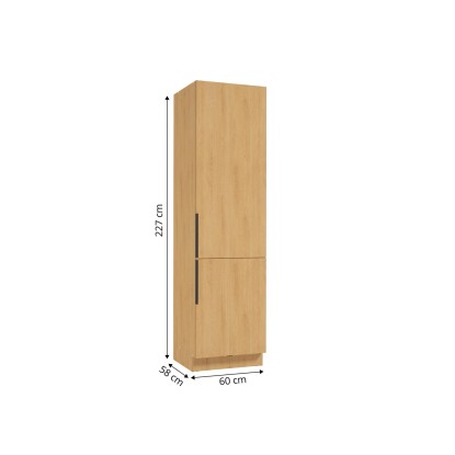 Front słupka imituje wygląd naturalnego drewna w kolorze dębu, dzięki czemu mebel zyskuje ponadczasowy, uniwersalny charakter i wprowadza ciepły, przytulny klimat do każdego wnętrza. Znajdujący się w zestawie czarny krawędziowy uchwyt prezentuje się elegancko i gustownie.