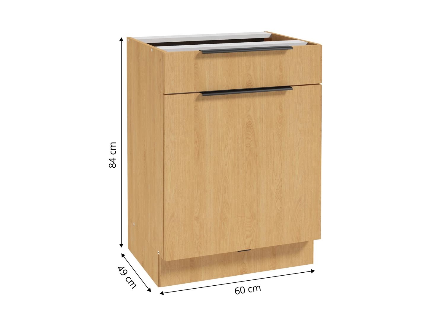 Front szafki imituje wygląd naturalnego drewna w kolorze dębu, dzięki czemu mebel zyskuje ponadczasowy, uniwersalny charakter i wprowadza ciepły, przytulny klimat do każdego wnętrza. Znajdujący się w zestawie czarny krawędziowy uchwyt prezentuje się elegancko i gustownie.