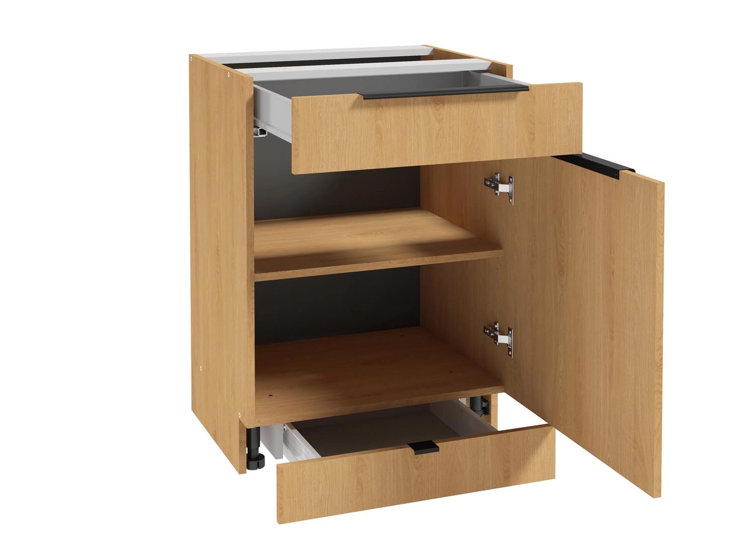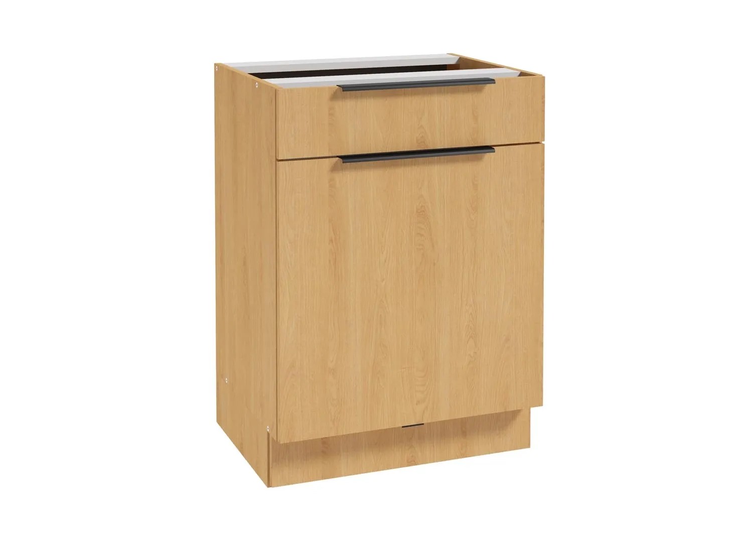 Idealne rozwiązanie dla posiadaczy niewielkich przestrzeni. Szafka jest praktyczna i pojemna przy jednoczesnym zachowaniu kompaktowych wymiarów. W jej wnętrzu zaprojektowano sporą przestrzeń na przechowywanie produktów spożywczych, talerzy i innych akcesoriów. Dodatkowo, szafka została wyposażona w szufladę ukrytą w cokole.