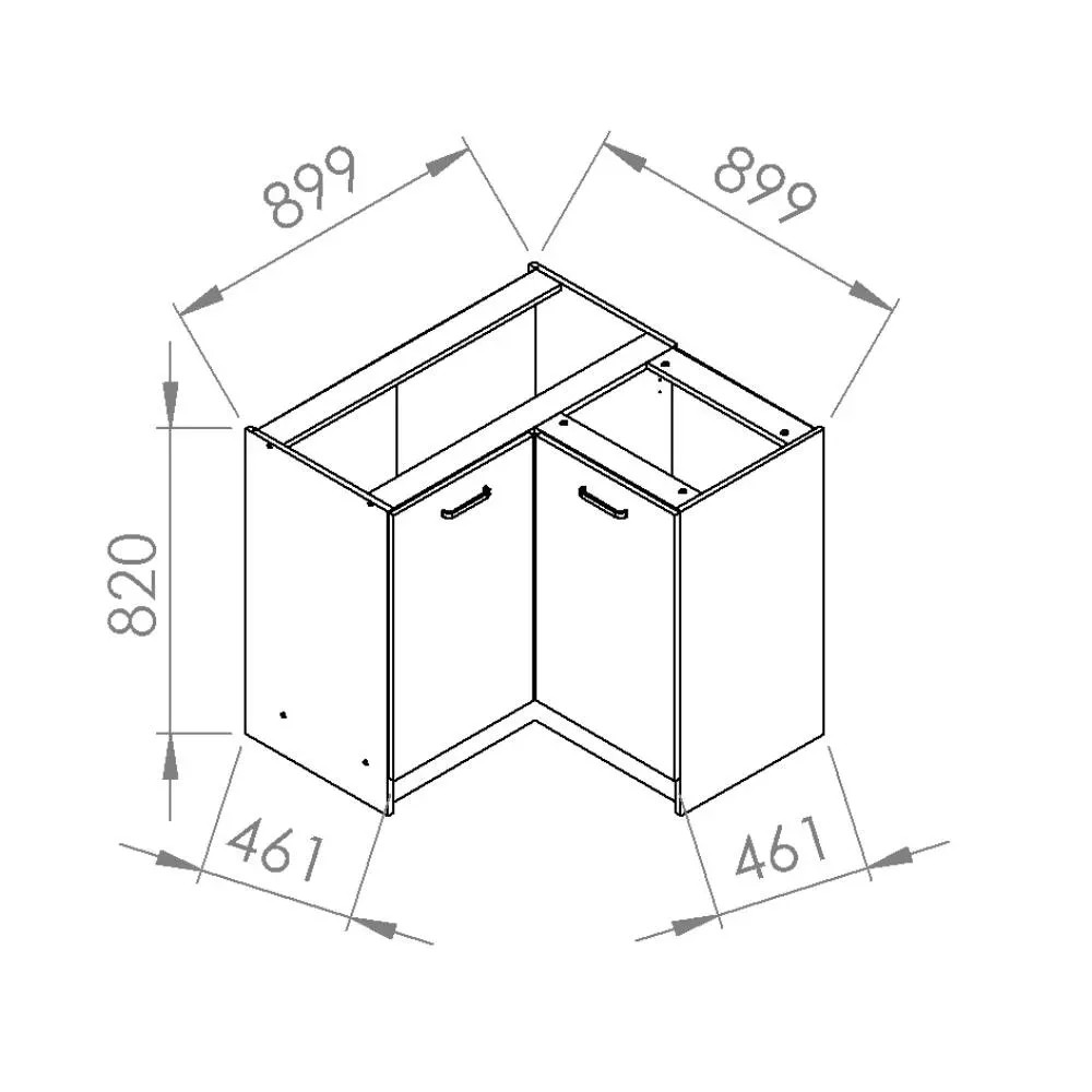 Meble wyposażono w uchwyty FREZ oraz mechanizmy z cichym domykiem (soft close), gwarantującym wysoki komfort użytkowania. Drzwi w szafkach z pojedynczymi drzwiami możesz zamontować na prawej lub lewej stronie mebla. Półki w szafkach mają wygodną opcję wyjmowania i regulacji wysokości, która ułatwia przechowywanie, zwłaszcza wysokich przedmiotów. Duża powierzchnia przechowywania sprawia, że w szafce narożnej najwygodniej umieścić większe i mniejsze garnki, patelnie i miski. Szeroko otwierane drzwi zapewniają swobodny dostęp do wnętrza szafki.