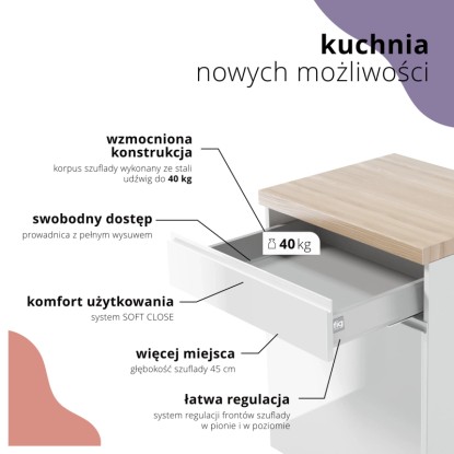Praktyczność zestawu podnosi wyposażenie szafek w funkcję cichego domyku.