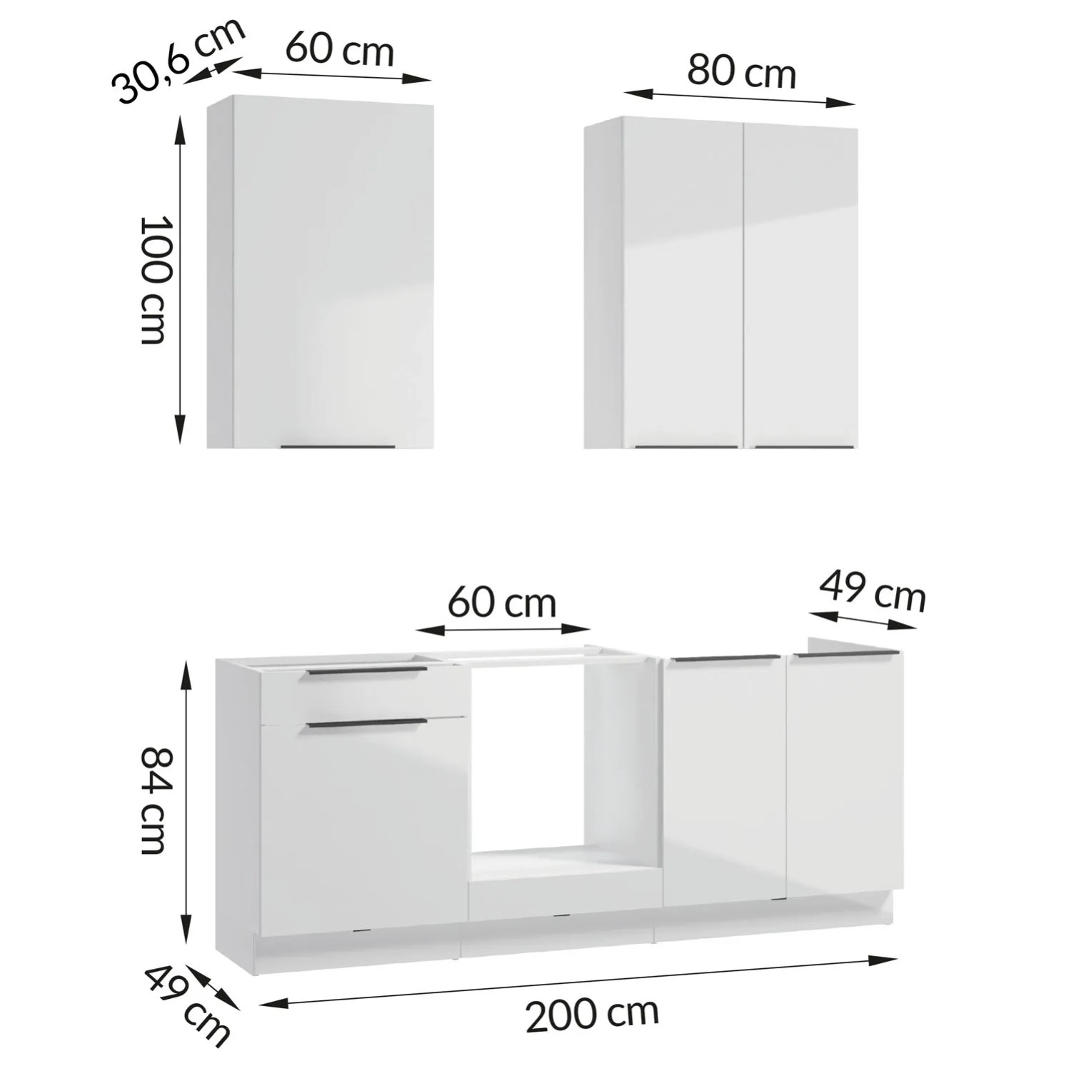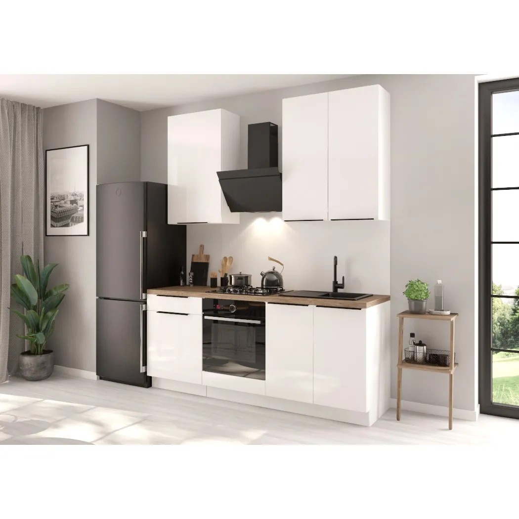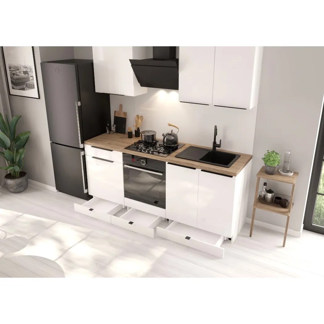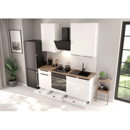 Elegancki i praktyczny zestaw mebli kuchennych o długości 200 cm, wykończony w uniwersalnym, białym kolorze.