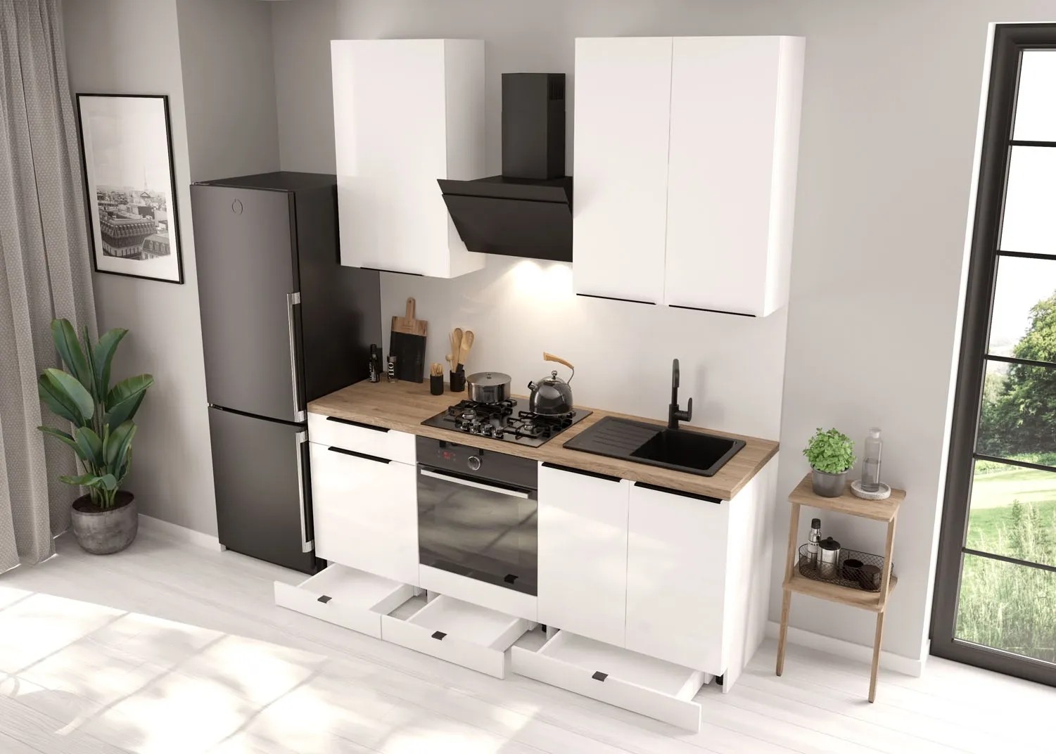 Zdjęcia aranżacyjne są zdjęciami poglądowymi, zestaw nie zawiera blatu oraz sprzętu AGD.