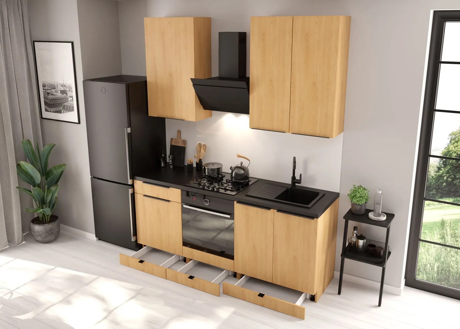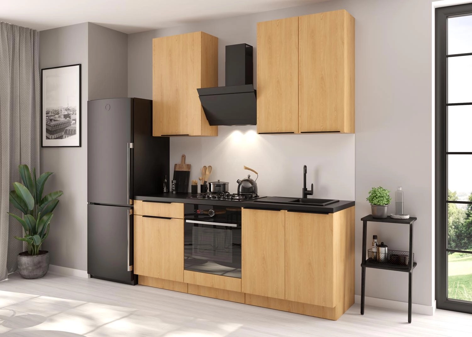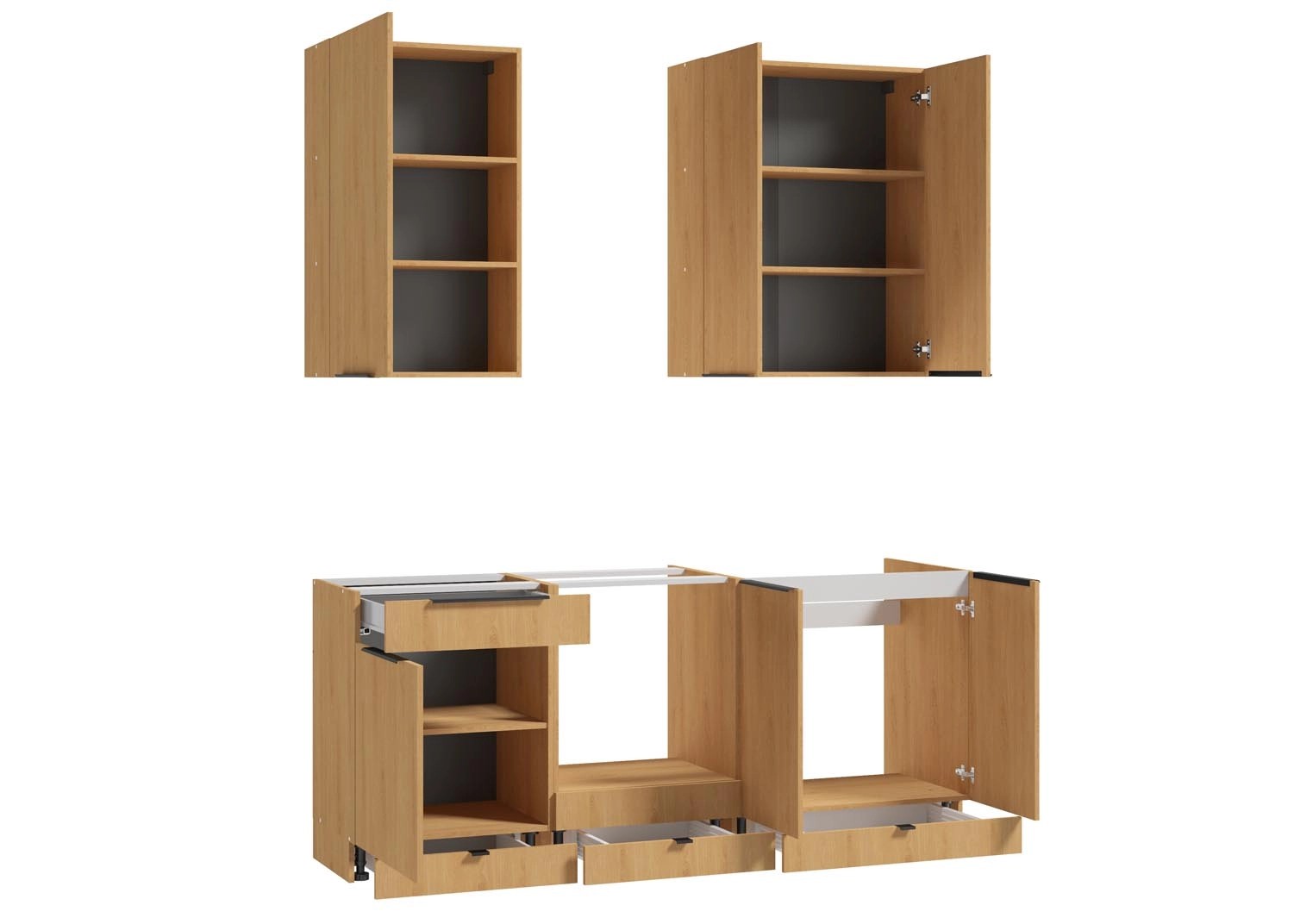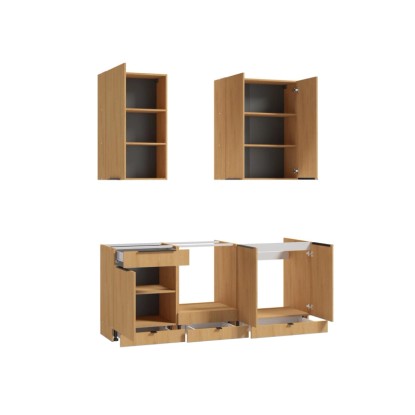 W zestawie znajdują się dwie wysokie szafki wiszące i trzy szafki dolne, w tym szafka pod piekarnik i szafka pod zlew. Wykonane zostały z płyty wiórowej i wyposażone w wygodne czarne uchwyty. Meble są pojemne, dzięki czemu pomieszczą wszystkie akcesoria niezbędne do gotowania. Funkcjonalność zestawu zwiększają ukryte szuflady w cokołach oraz mechanizm cichego domyku.