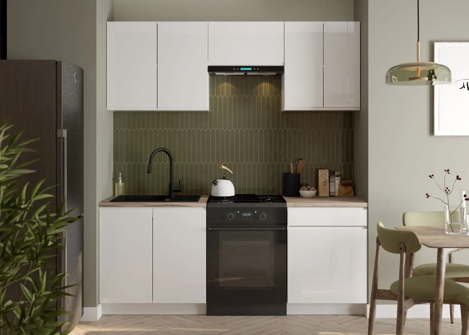 Zdjęcia aranżacyjne są zdjęciami poglądowymi, zestaw nie zawiera blatu oraz sprzętu AGD.