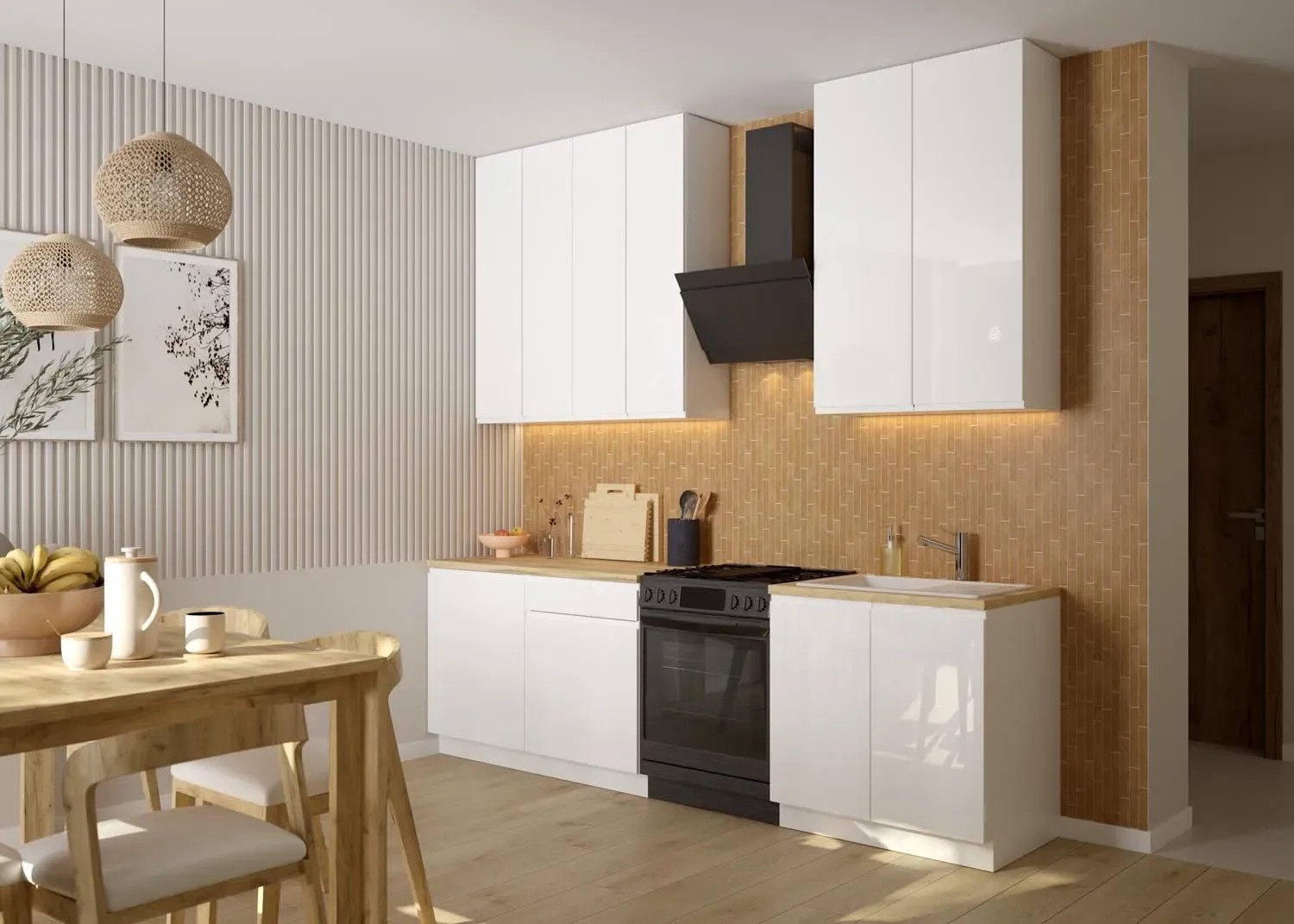 Zdjęcia aranżacyjne są zdjęciami poglądowymi, zestaw nie zawiera blatu oraz sprzętu AGD.