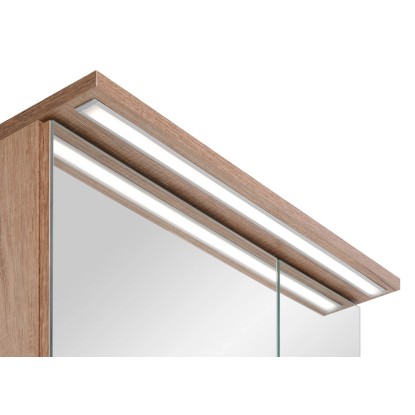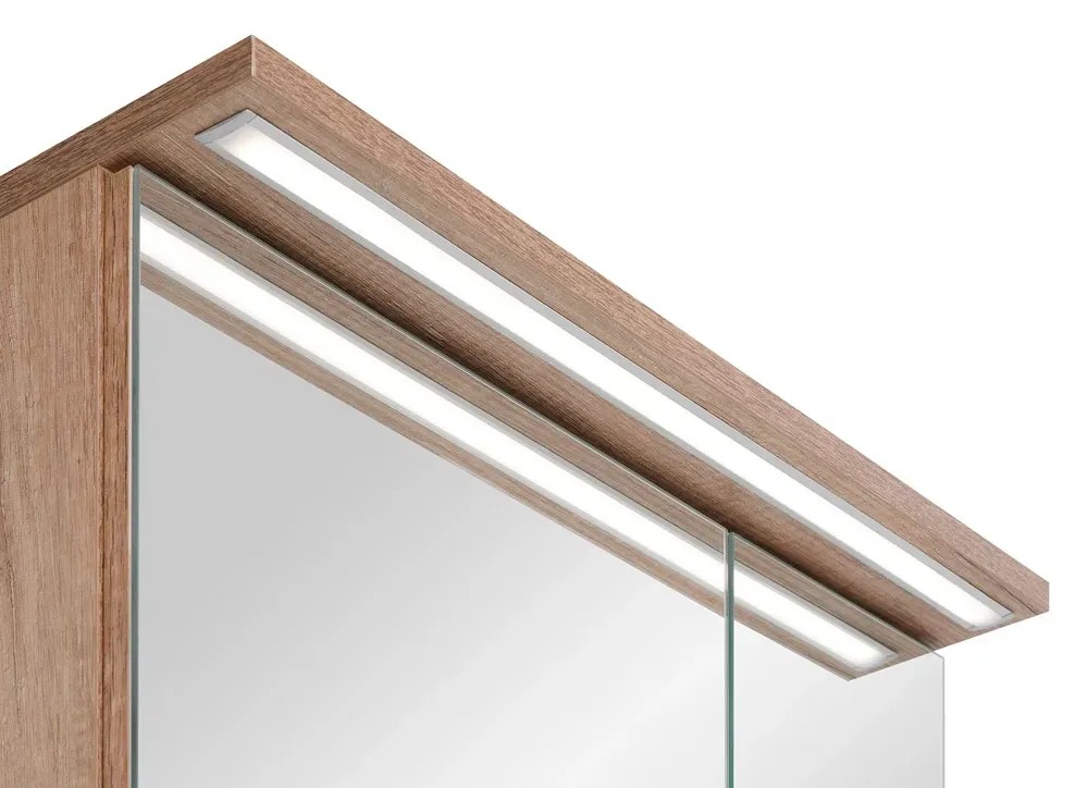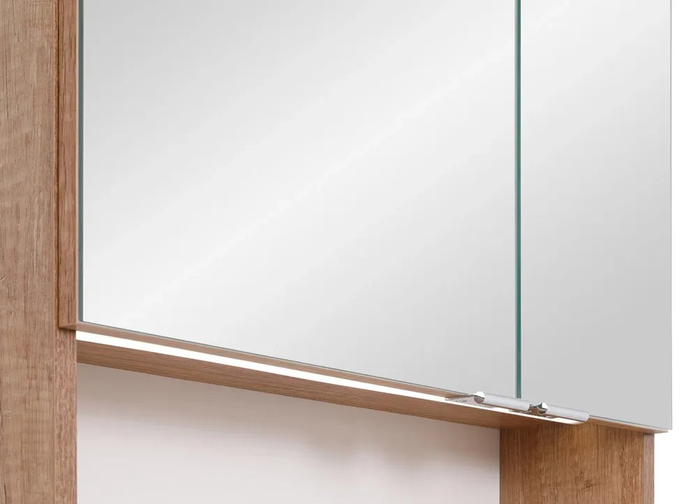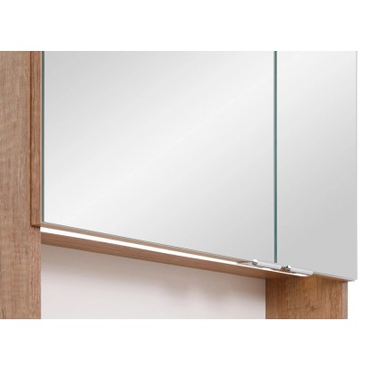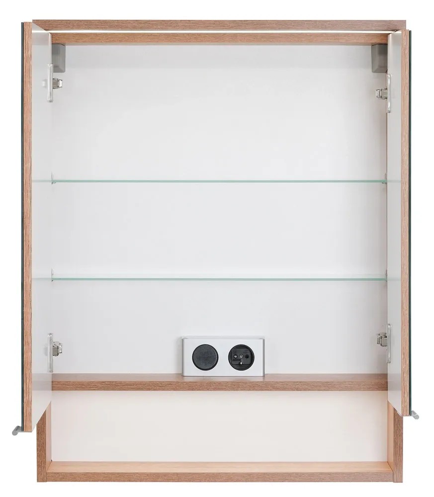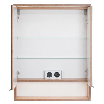 Praktyczne wnętrze szafki zostało zaprojektowane z myślą o funkcjonalności. Dodatkowa półka umożliwia organizację przestrzeni, a lustrzane powierzchnie sprawiają, że mebel doskonale komponuje się z pozostałymi elementami wyposażenia. Oświetlenie umieszczone wewnątrz szafki to praktyczne rozwiązanie, ułatwiające wykonanie makijażu czy korzystanie z mebla wieczorem bez konieczności włączania głównego światła w pomieszczeniu.