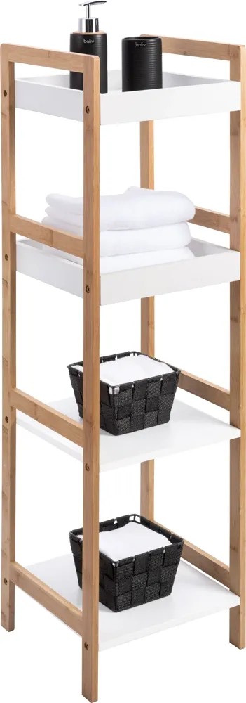 Regał łazienkowy 4-poziomowy. Składa się z 2 białych półek, 2 białych organizerów i ramy z bambusa. Regał łazienkowy oferuje miejsce na ręczniki i lekkie przybory łazienkowe. Maksymalne obciążenie jednej półki: 3kg.
