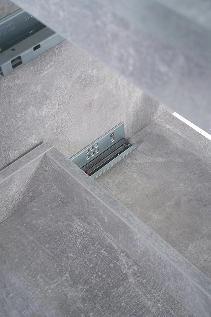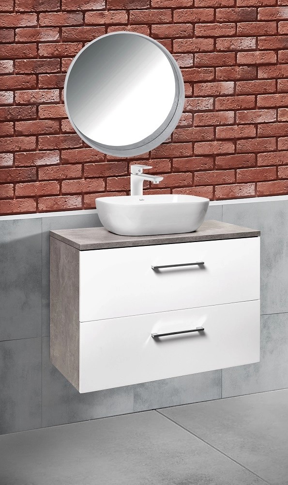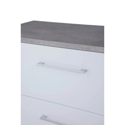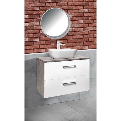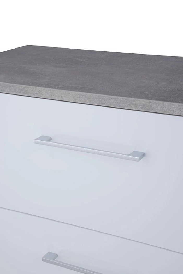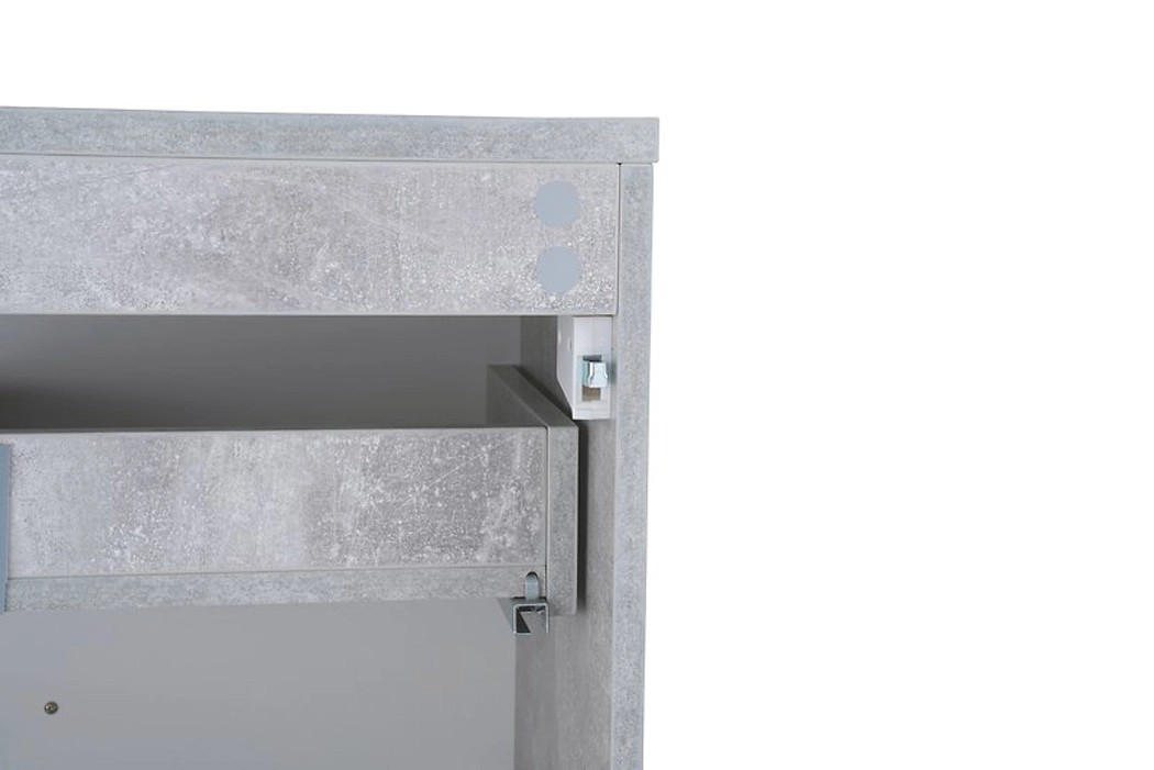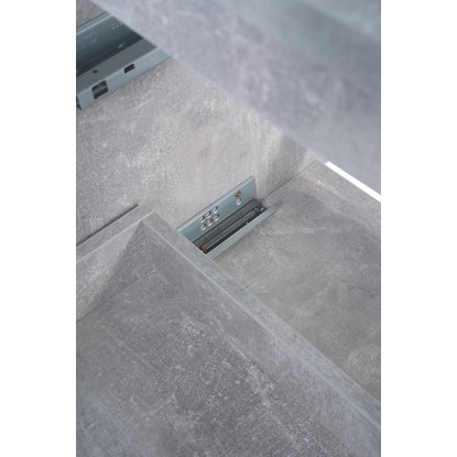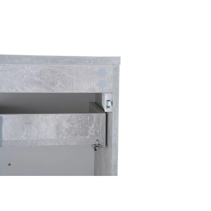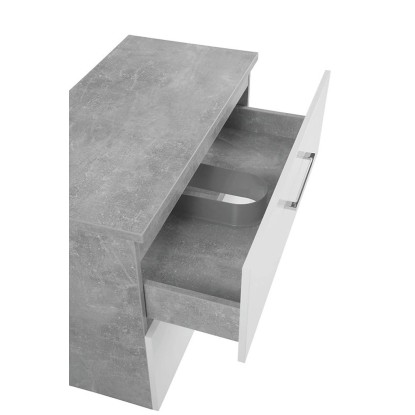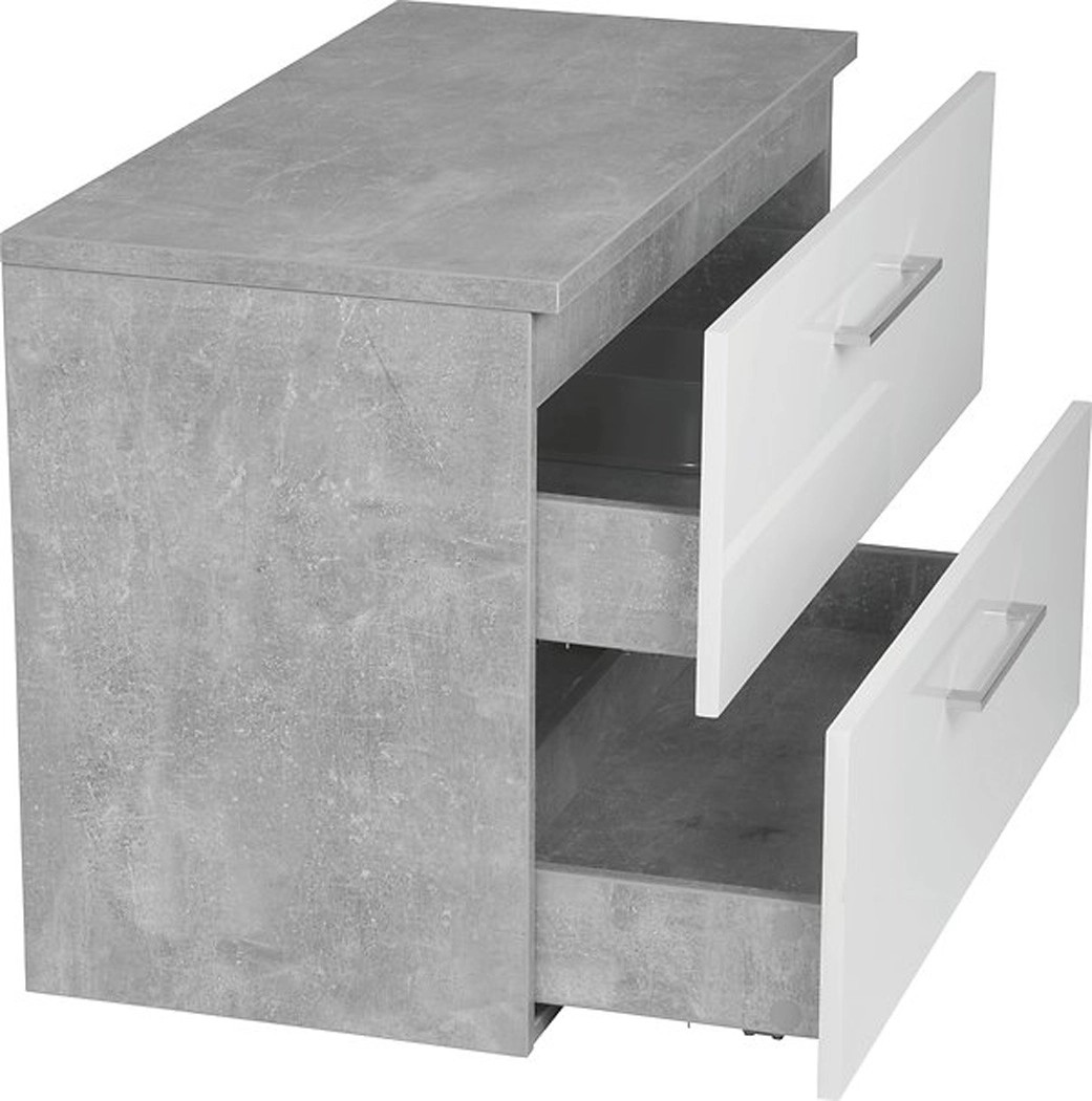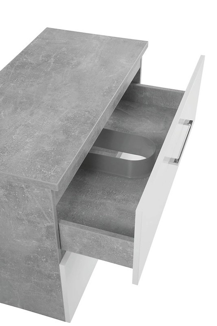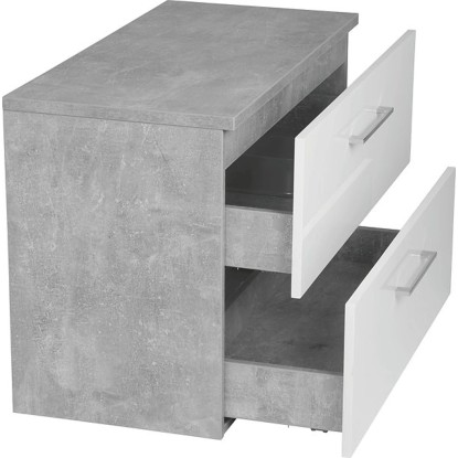 Prosta i elegancka, wisząca szafka pod umywalkę z białym przodem i bokami imitującymi beton. Posiada dwie pojemne szuflady z systemem cichego domykania. Szafka do samodzielnego montażu.