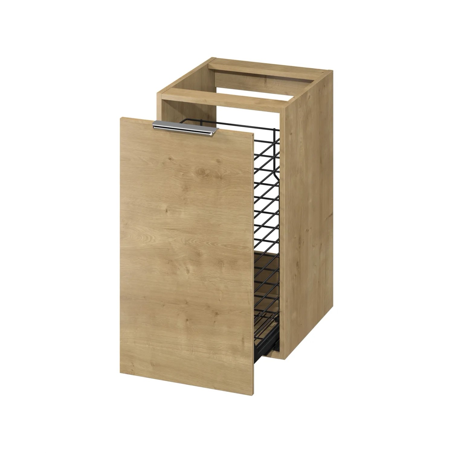 Szafka z dwudzielnym koszem to estetyczne miejsce do przechowywania rzeczy do prania, które pomoże zaprowadzić ład wśród Twoich ubrań. Metalowy kosz posiada 2 komory, które ułatwią segregację ubrań. Korpus i front szafki zostały wykonane z płyty wiórowej. Istnieje możliwość dokupienia oddzielnie uchwytów w kolorze czarnym i srebrnym oraz dekoracyjnych nóżek w tym samym kolorze co uchwyty.