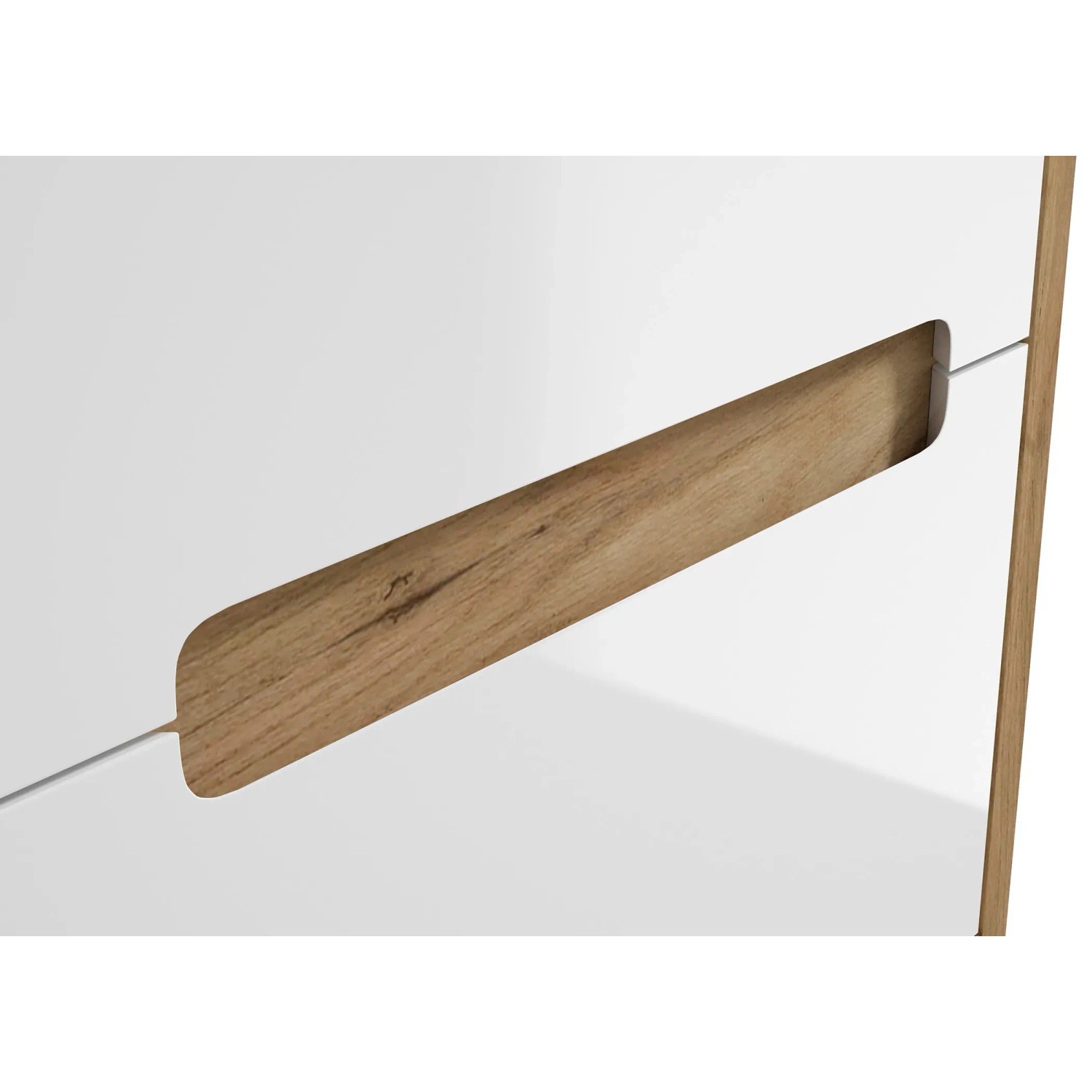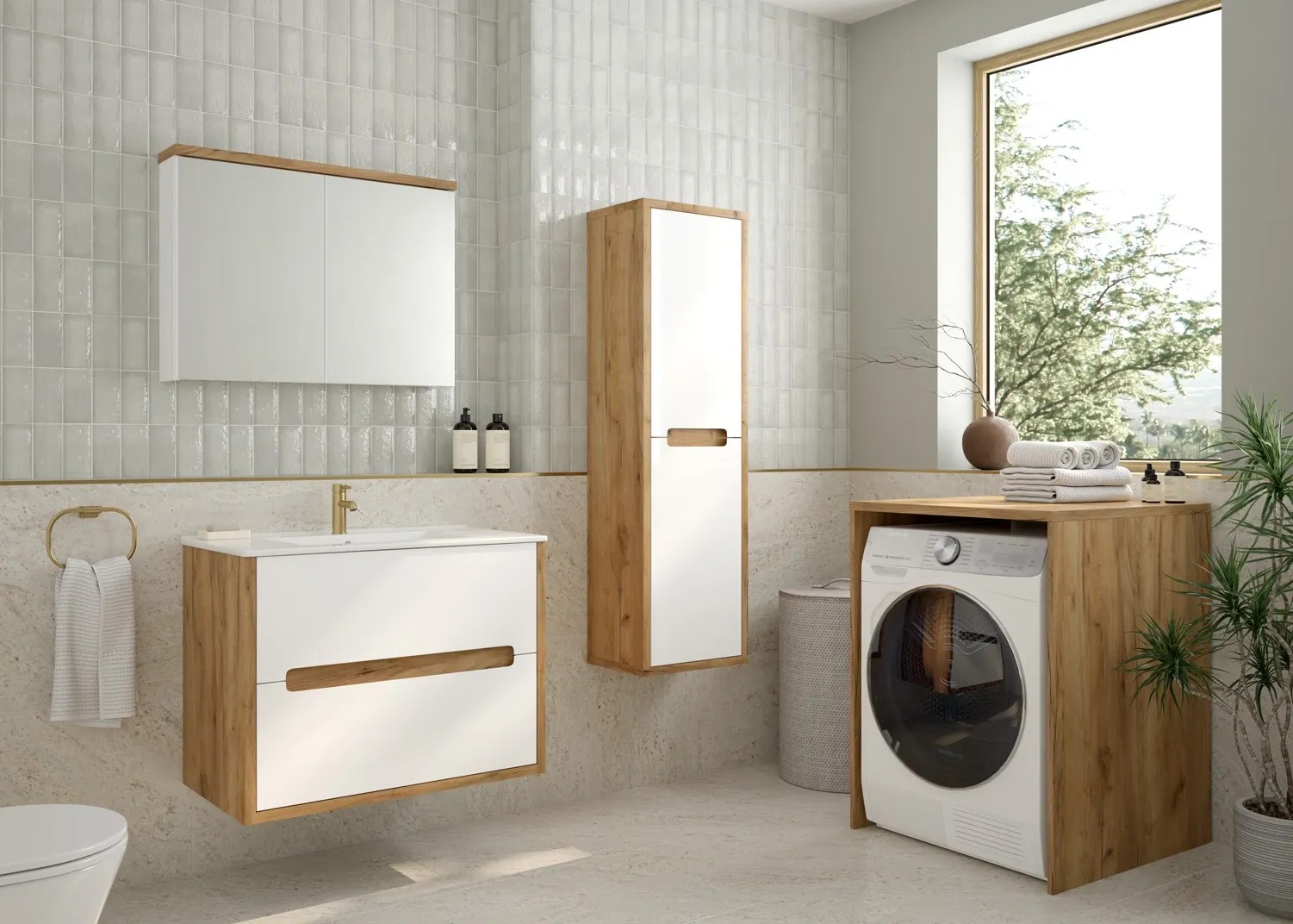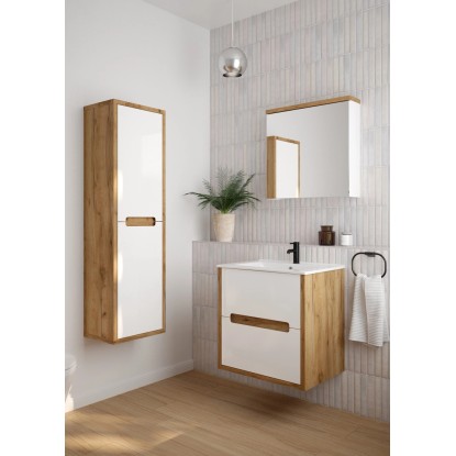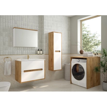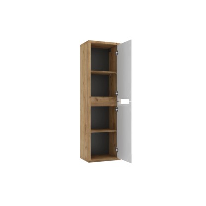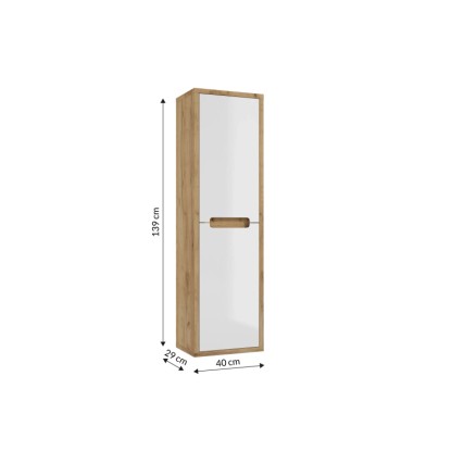 Fronty słupka są w kolorze białym, co nadaje zestawowi świeżości i nowoczesnego wyglądu, natomiast dekor w odcieniu dębu złotego dodaje ciepła i elegancji. Dzięki funkcji łagodnego zamykania, słupek zamyka się cicho i płynnie, co zwiększa komfort użytkowania.
