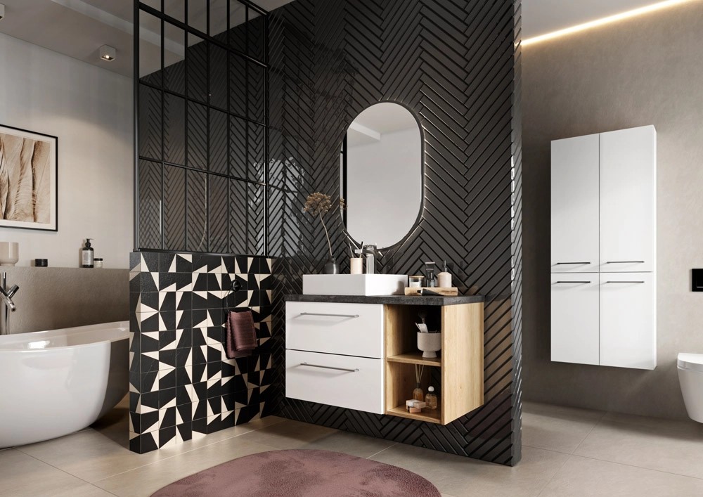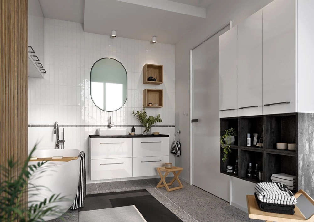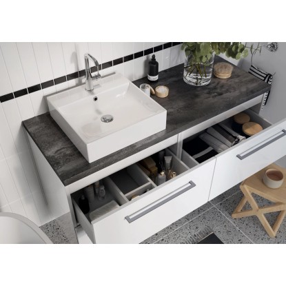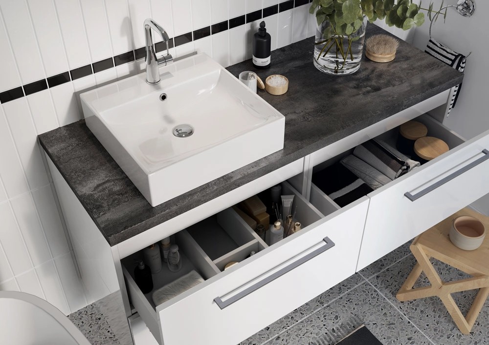 Łazienka, jako jedno z ważniejszych pomieszczeń w domu powinna spełniać dwie funkcje: estetyczną i funkcjonalną. Doskonała organizacja środków higienicznych, chemicznych i konfekcji łazienkowych, a także dobór odpowiedniej armatury do ceramiki pozwoli na stworzenie łazienki marzeń. Wybierz blat w odpowiednim rozmiarze i interesującym kolorze, dobierz do niego szafkę podblatową i otwartą, np. na ręczniki lub papier toaletowy, następnie dopasujalkę nablatową i uzupełnij aranżację o wiszącą szafę i/lub kubik.