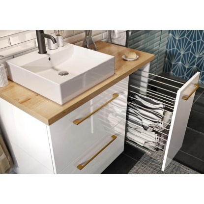 Szafka pod blat do łazienki producenta NAS to eleganckie i stylowe rozwiązanie do każdej łazienki tworzonej w minimalistycznym stylu. Szafka łazienkowa została wykonana z odpornej na wilgoć lakierowanej płyty MDF w kolorze białym. Szafka obejmuje uniwesalną szufladę z mechanizmem SOFT CLOSE. Eleganckie metalowe uchwytynie występują w zestawie, sprzedawane są oddzielnie.